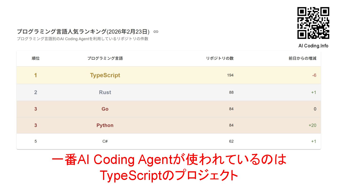 一番AI Coding Agentが使われているのは TypeScriptのプロジェクト AI Coding.Info
