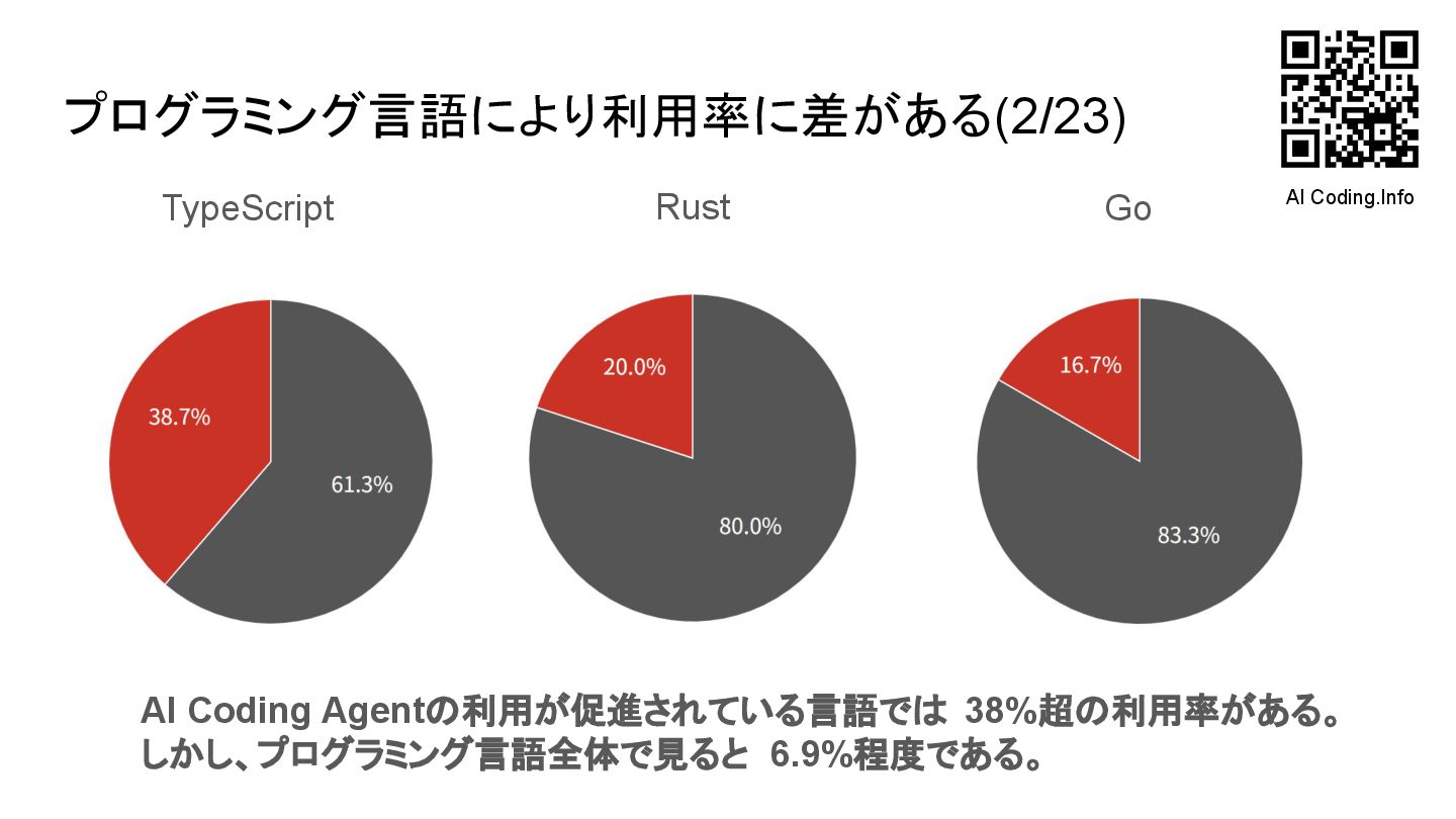 プログラミング言語により利用率に差がある(2/23) TypeScript Rust Go AI Coding Agentの利用が促進されている言語では 38%超の利用率がある。 しかし、プログラミング言語全体で見ると 6.9%程度である。