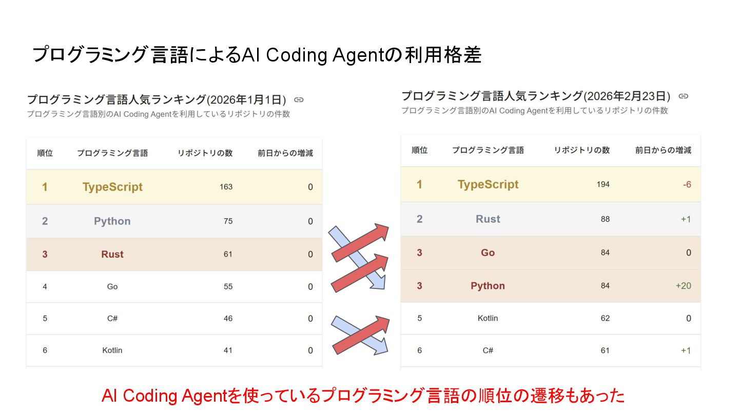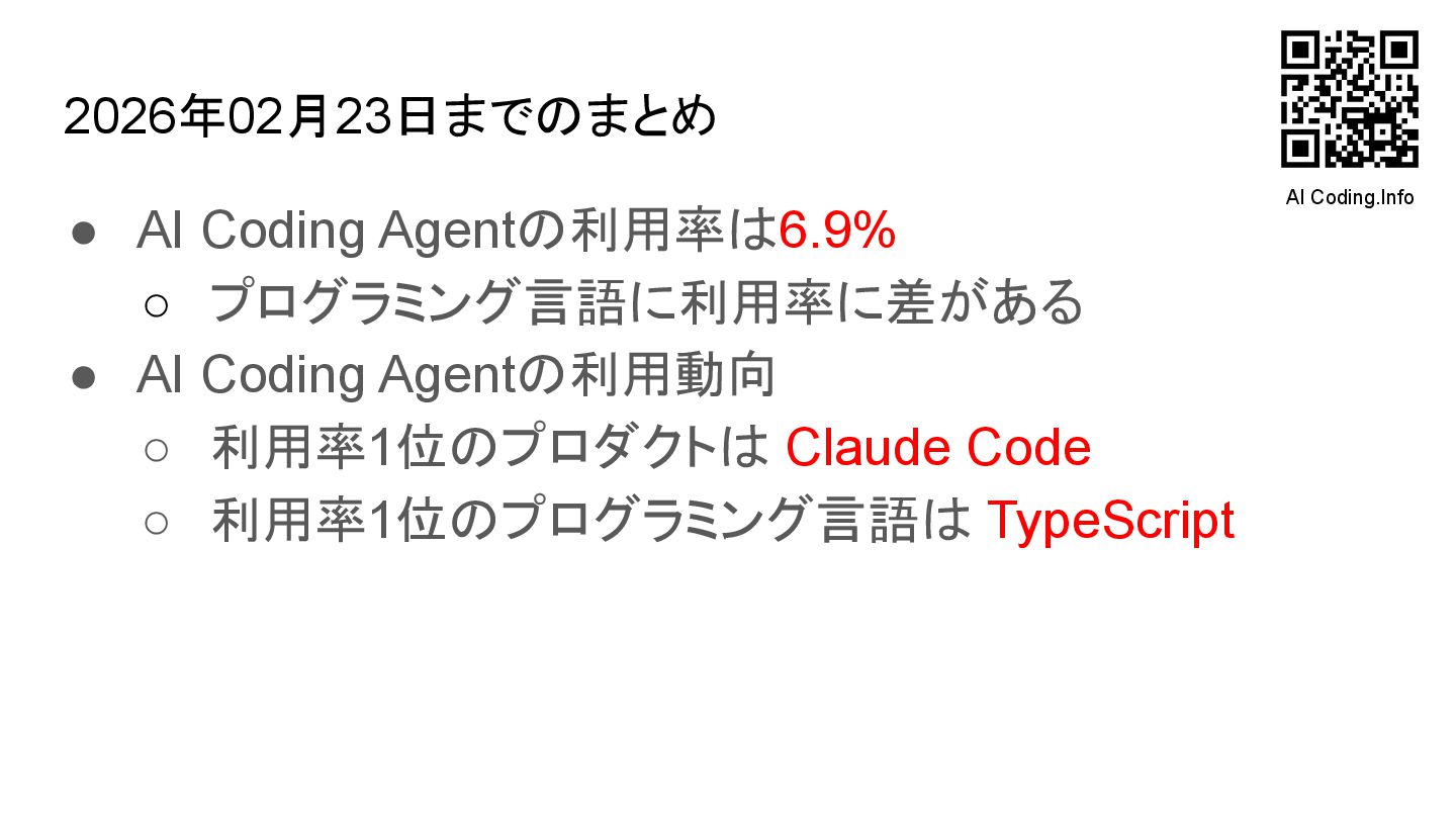 2026年02月23日までのまとめ • AI Coding Agentの利用率は6.9% ◦ プログラミング言語に利用率に差がある • AI Coding