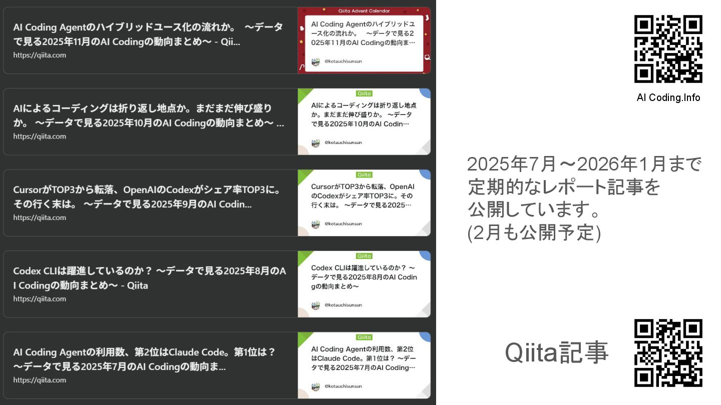 AI Coding.Info 2025年7月~2026年1月まで 定期的なレポート記事を 公開しています。 (2月も公開予定) Qiita記事