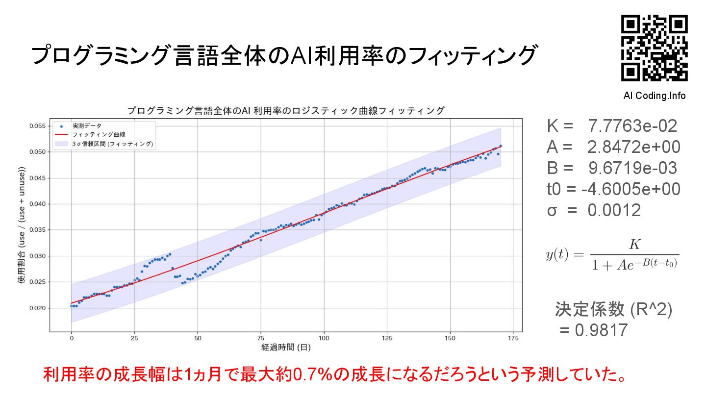 t0 = -4.6005e+00 σ = 0.0012 決定係数 (R^2) = 0.9817 AI Coding.Info 利用率の成長幅は1ヵ月で最大約0.7%の成長になるだろうという予測していた。