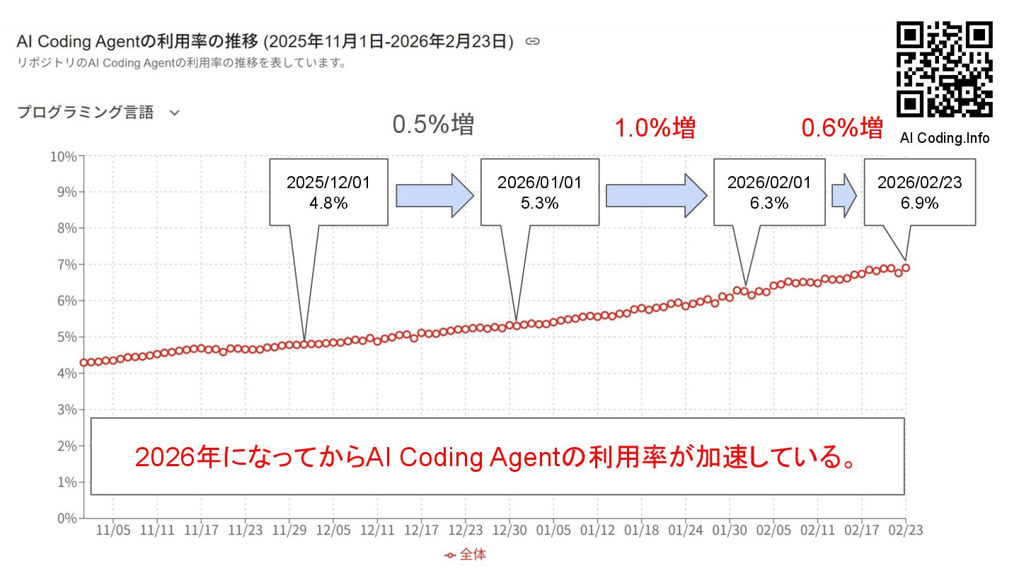 0.5%増 1.0%増 0.6%増 2026年になってからAI Coding Agentの利用率が加速している。