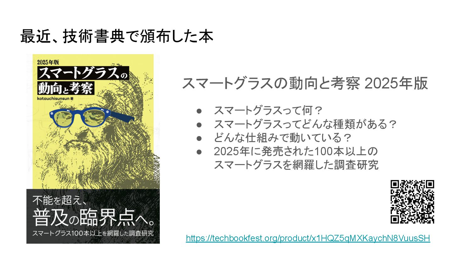 2025年に発売された100本以上の スマートグラスを網羅した調査研究 https://techbookfest.org/product/x1HQZ5qMXKaychN8VuusSH