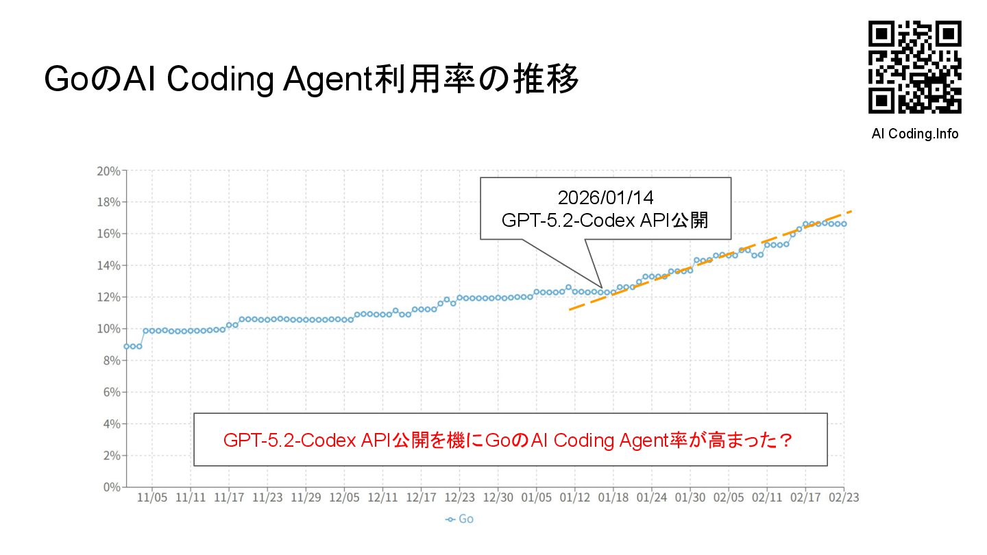 GoのAI Coding Agent利用率の推移 2026/01/14 GPT-5.2-Codex API公開 GPT-5.2-Codex API公開を機にGoのAI Coding Agent率が高まった?