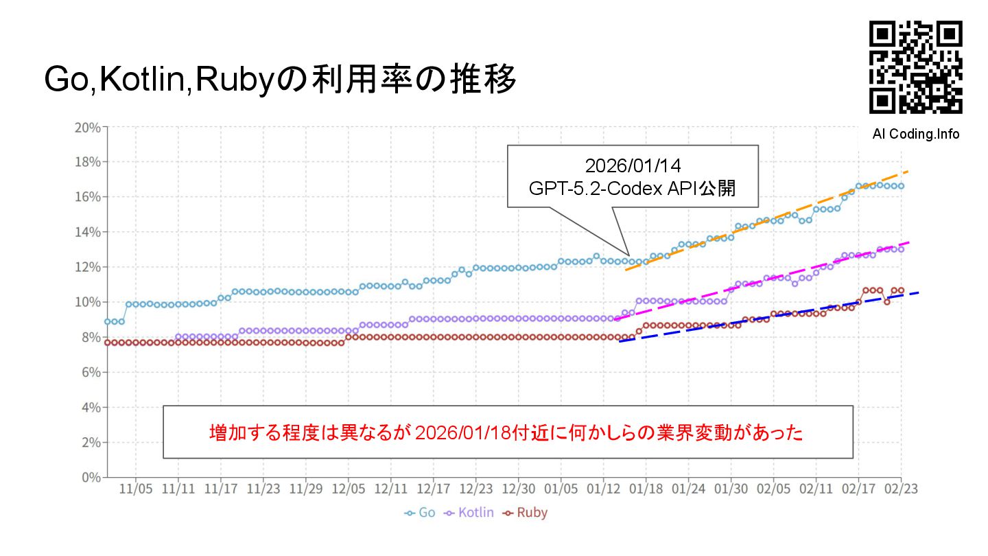 Go,Kotlin,Rubyの利用率の推移 2026/01/14 GPT-5.2-Codex API公開 増加する程度は異なるが 2026/01/18付近に何かしらの業界変動があった AI Coding.Info