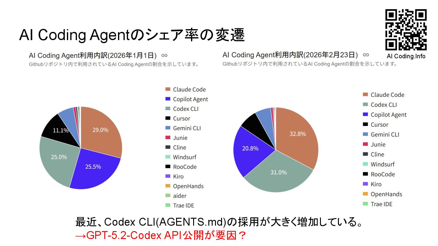 AI Coding Agentのシェア率の変遷 最近、Codex CLI(AGENTS.md)の採用が大きく増加している。 →GPT-5.2-Codex API公開が要因? AI Coding.Info