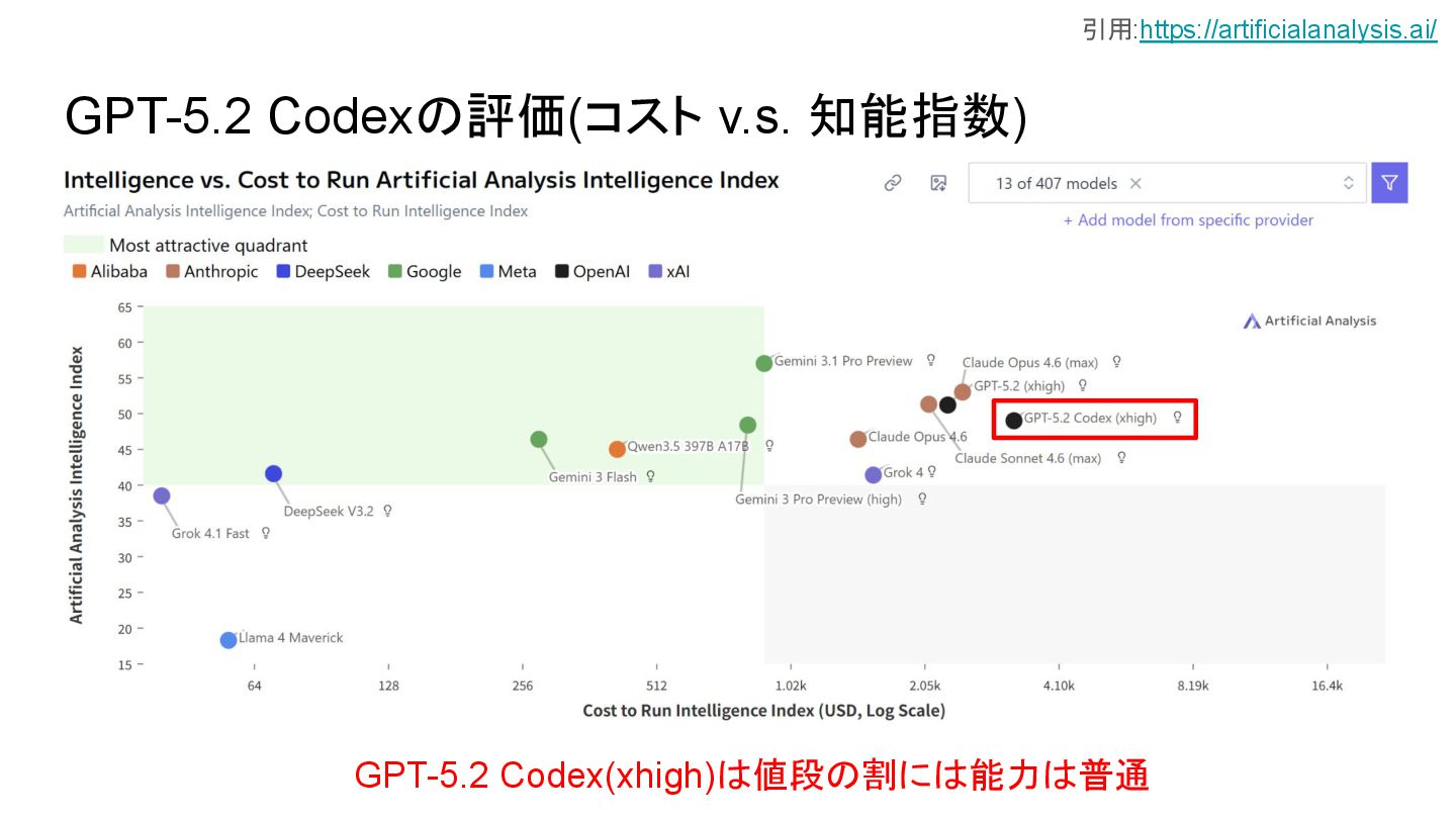 GPT-5.2 Codexの評価(コスト v.s. 知能指数) 引用:https://artificialanalysis.ai/ GPT-5.2 Codex(xhigh)は値段の割には能力は普通
