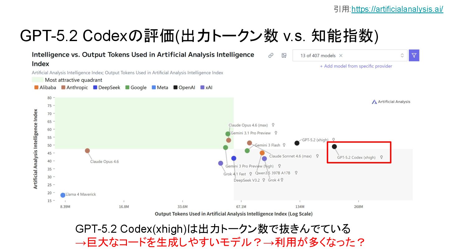 GPT-5.2 Codexの評価(出力トークン数 v.s. 知能指数) 引用:https://artificialanalysis.ai/ GPT-5.2 Codex(xhigh)は出力トークン数で抜きんでている →巨大なコードを生成しやすいモデル?→利用が多くなった?