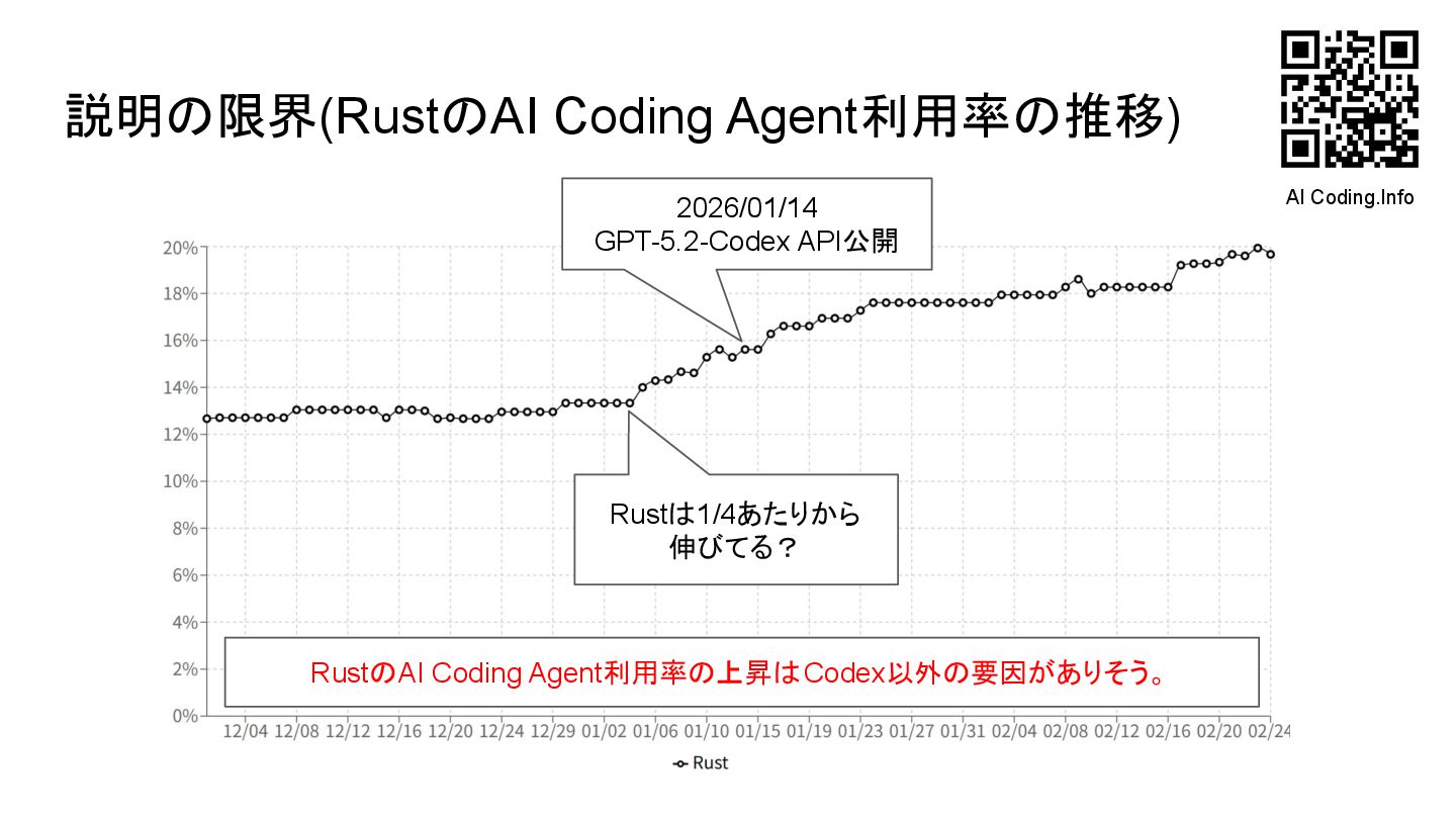 説明の限界(RustのAI Coding Agent利用率の推移) 2026/01/14 GPT-5.2-Codex API公開 Rustは1/4あたりから 伸びてる? RustのAI Coding