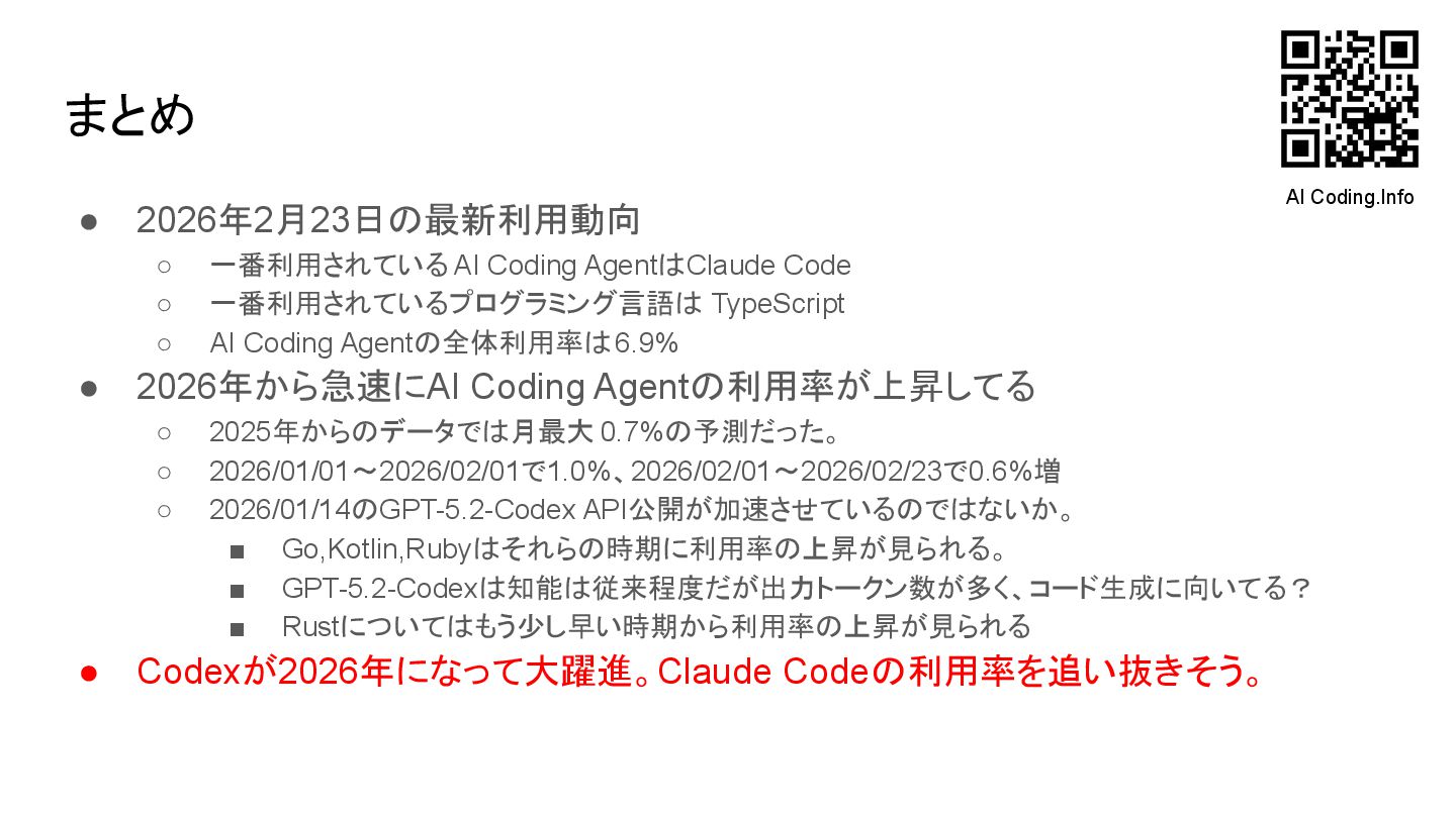 一番利用されているプログラミング言語は TypeScript ◦ AI Coding Agentの全体利用率は6.9% • 2026年から急速にAI Coding Agentの利用率が上昇してる ◦ 2025年からのデータでは月最大 0.7%の予測だった。 ◦ 2026/01/01~2026/02/01で1.0%、2026/02/01~2026/02/23で0.6%増 ◦ 2026/01/14のGPT-5.2-Codex API公開が加速させているのではないか。 ▪ Go,Kotlin,Rubyはそれらの時期に利用率の上昇が見られる。 ▪ GPT-5.2-Codexは知能は従来程度だが出力トークン数が多く、コード生成に向いてる? ▪ Rustについてはもう少し早い時期から利用率の上昇が見られる • Codexが2026年になって大躍進。Claude Codeの利用率を追い抜きそう。 AI Coding.Info