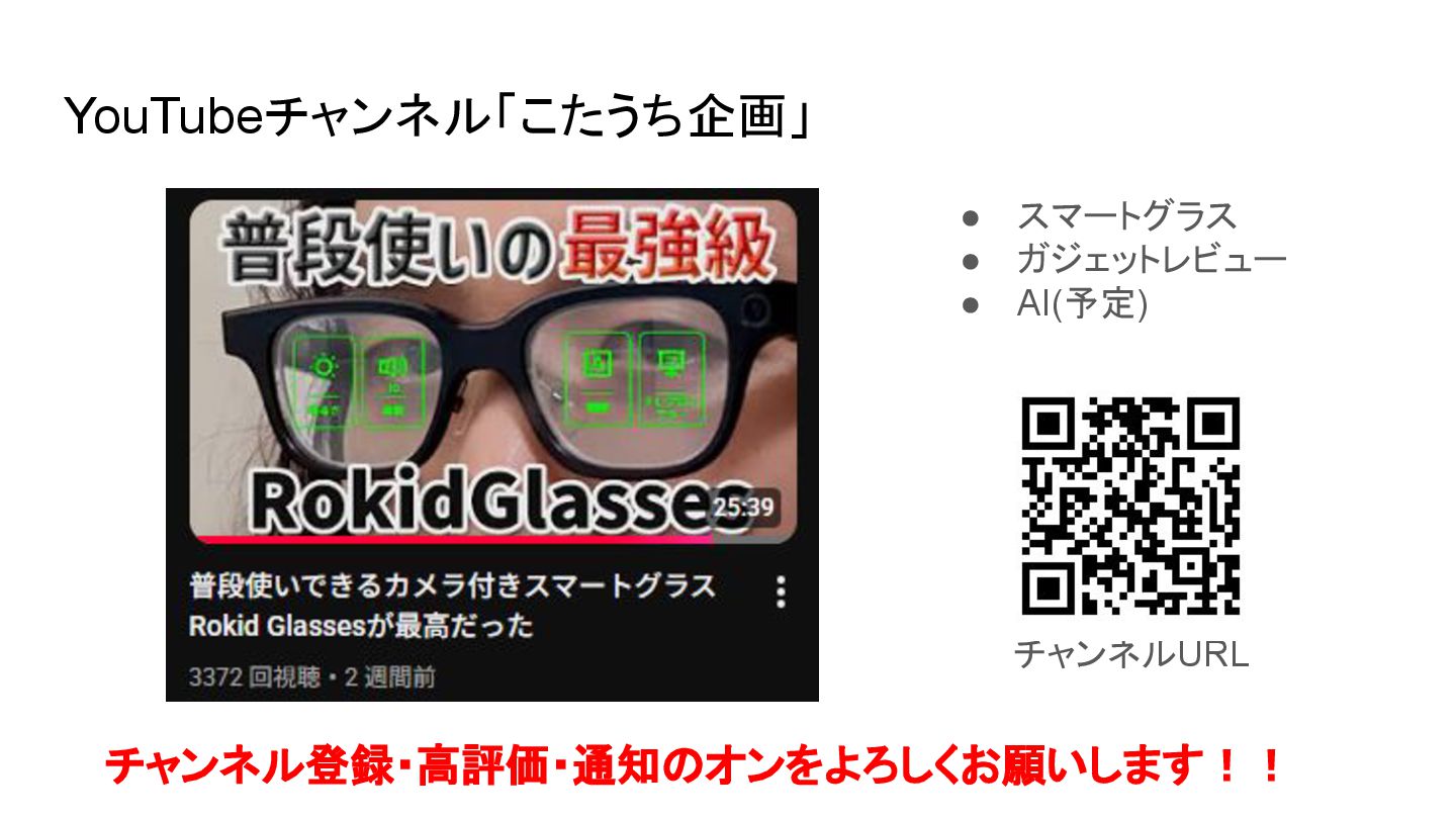 YouTubeチャンネル「こたうち企画」 チャンネルURL チャンネル登録・高評価・通知のオンをよろしくお願いします!! • スマートグラス • ガジェットレビュー • AI(予定)