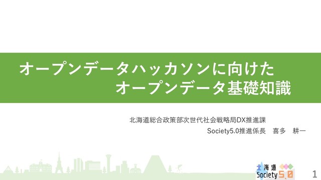 1 オープンデータハッカソンに向けた オープンデータ基礎知識 北海道総合政策部次世代社会戦略局DX推進課 Society5.0推進係長 喜多 耕一