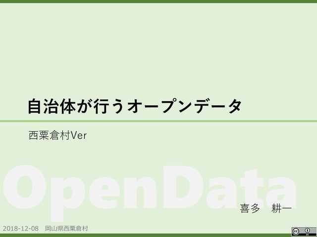 2018年12月8日に岡山県西粟倉村で行われた、オープンデータ勉強会の資料です。 スライドはオープンデータですので、自由に利用してください。