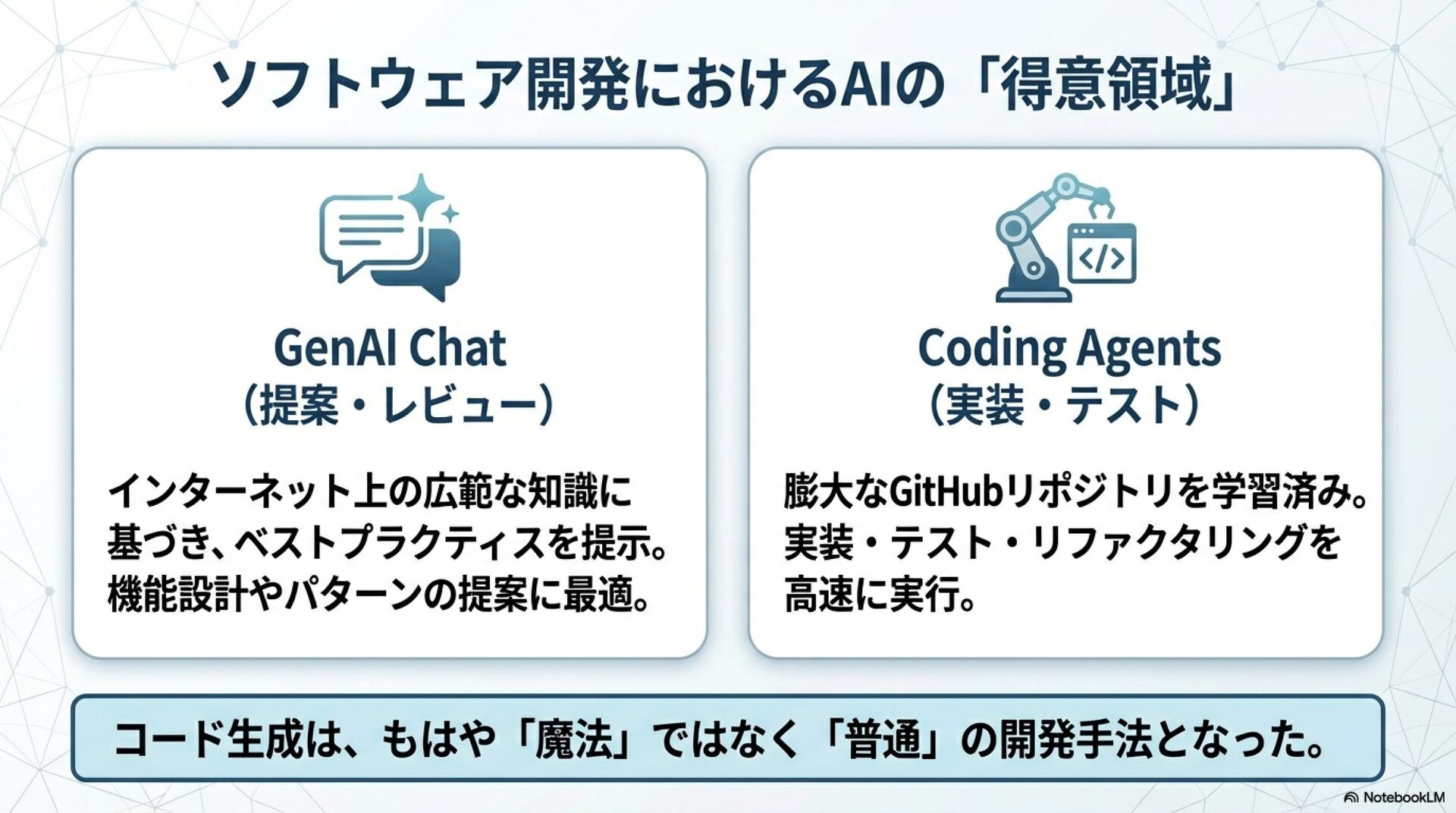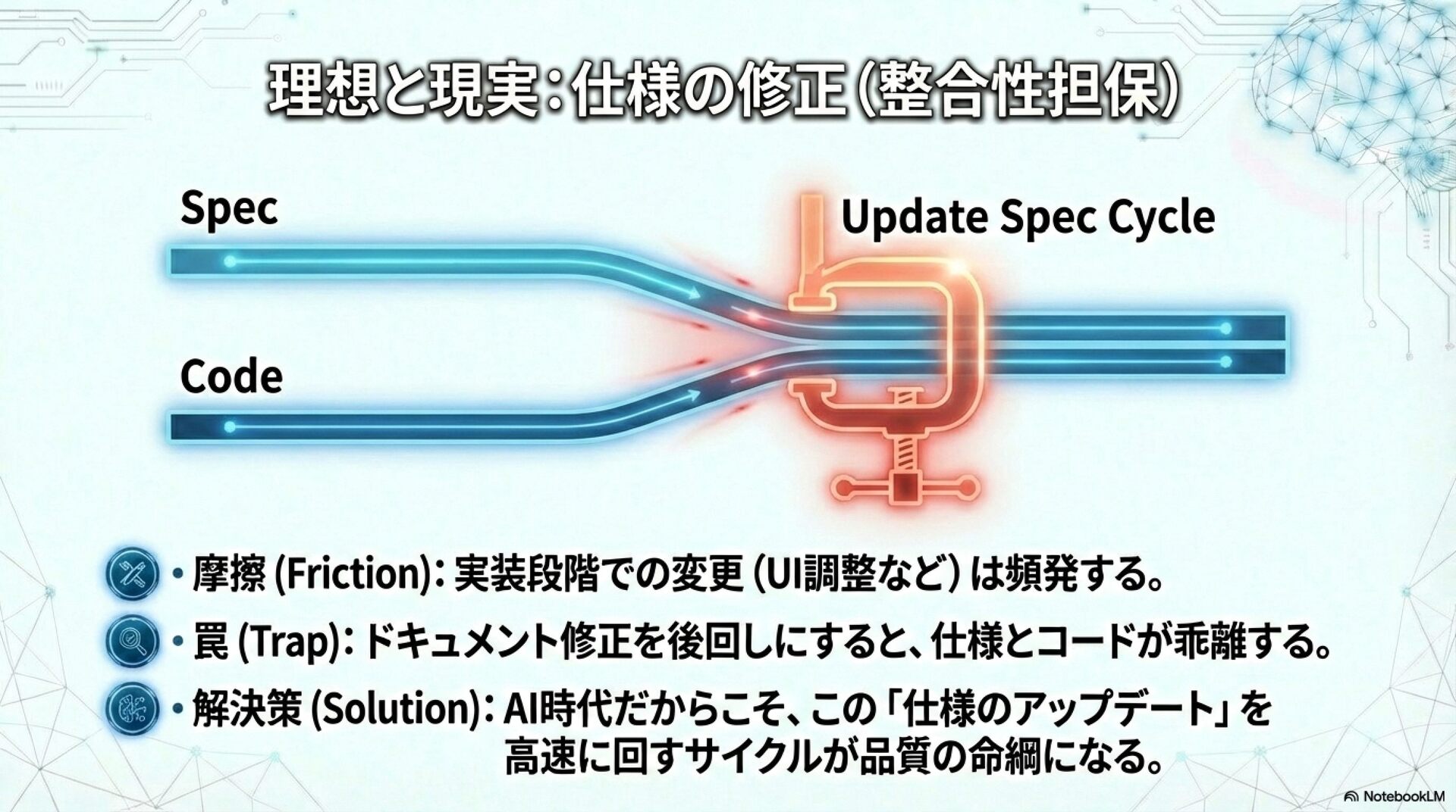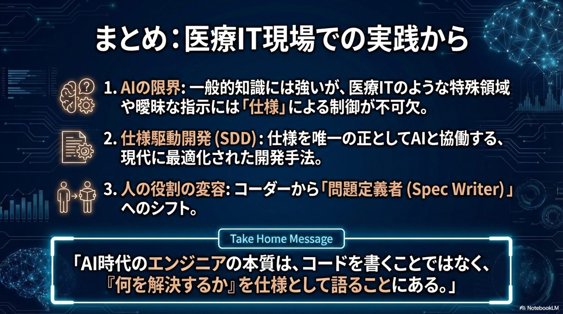 医療ITシステム開発の現場を例に、仕様駆動開発を軸としたAI活用の実践例を紹介します。 従来のチーム開発にAIエージェントを組み込むことで、開発生産性を高めつつ、品質や安全性をどう守っているのか。について話します。