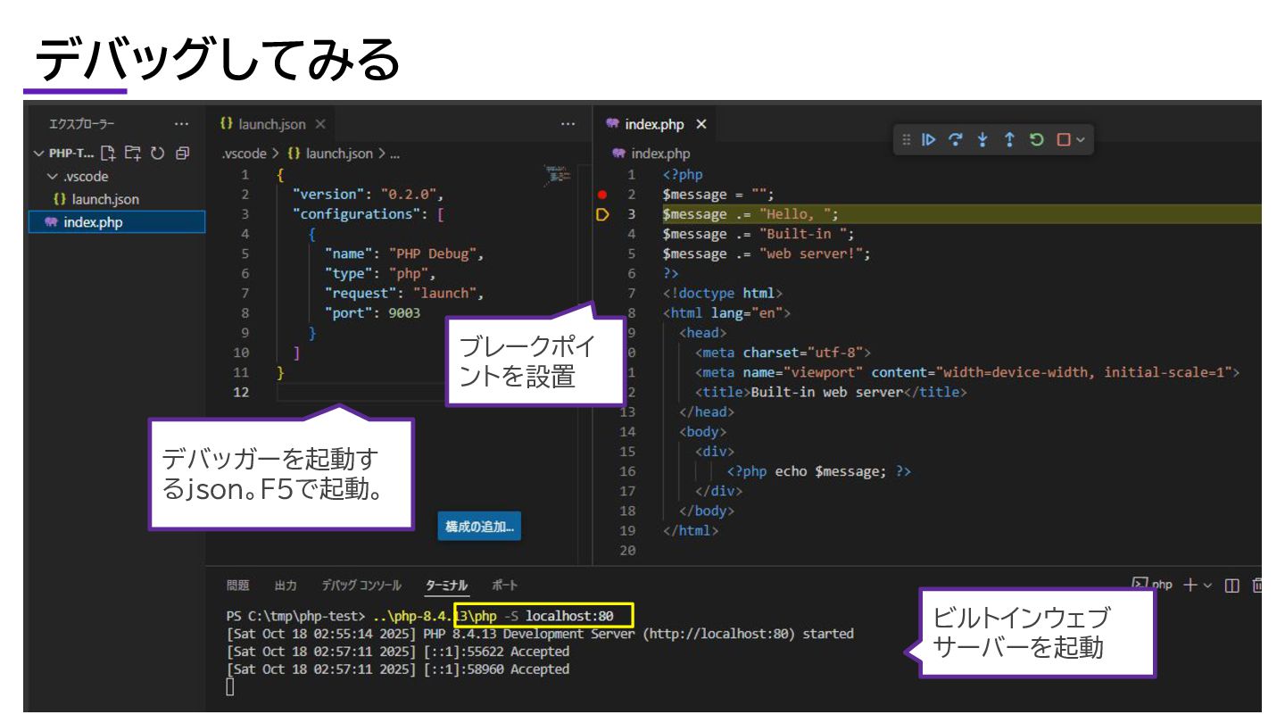デバッグしてみる デバッガーを起動す るjson。F5で起動。 ブレークポイ ントを設置 ビルトインウェブ サーバーを起動