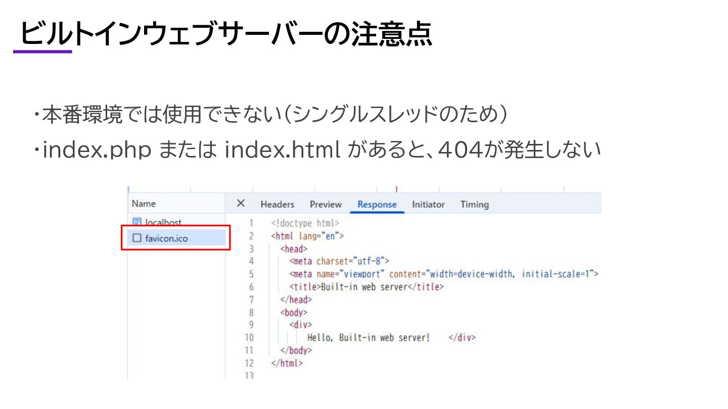 ビルトインウェブサーバーの注意点 ・本番環境では使用できない(シングルスレッドのため) ・index.php または index.html があると、404が発生しない