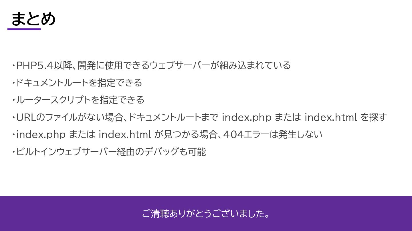 index.html が見つかる場合、404エラーは発生しない ・ビルトインウェブサーバー経由のデバッグも可能 ご清聴ありがとうございました。 まとめ