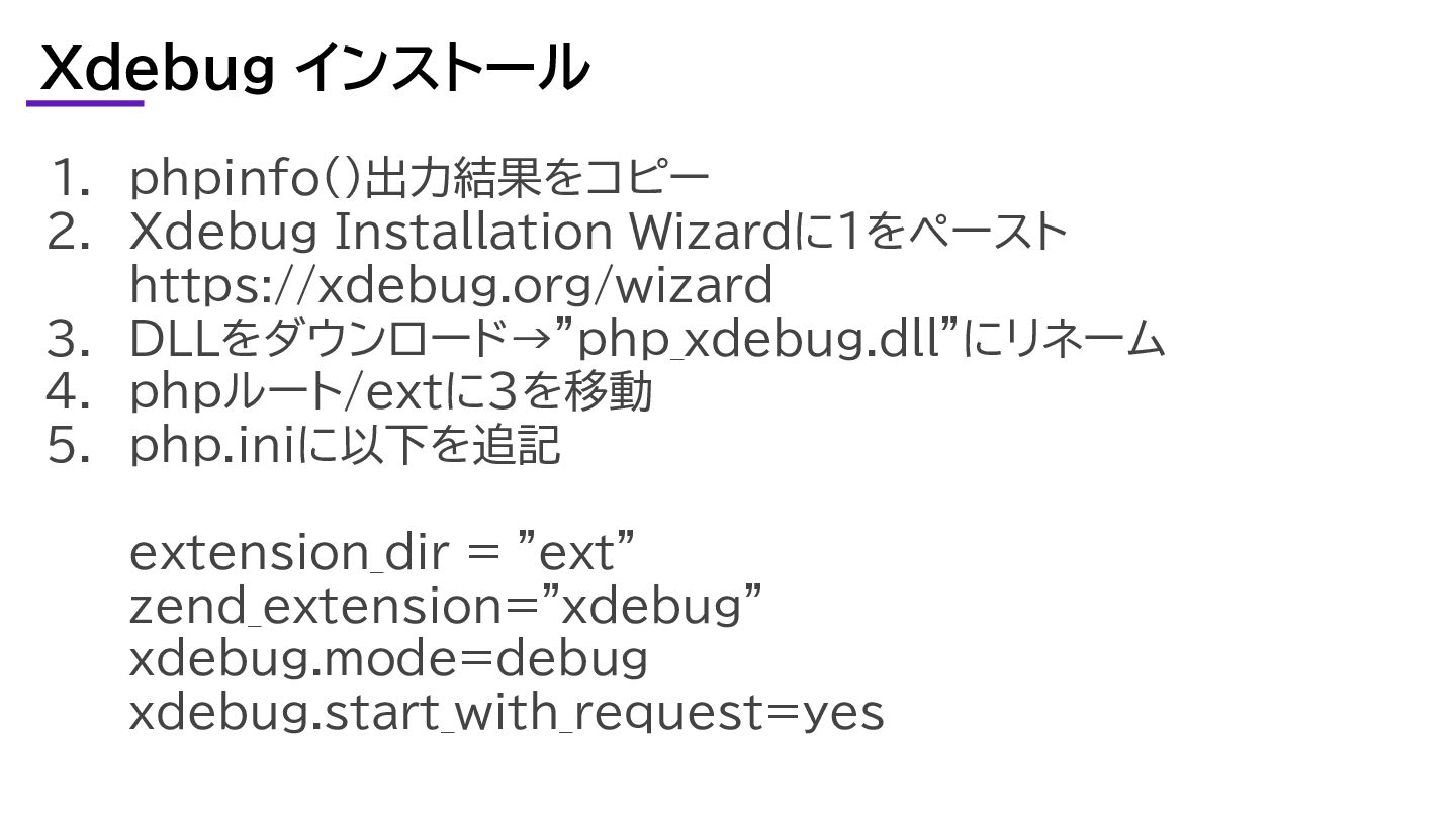 DLLをダウンロード→”php_xdebug.dll”にリネーム 4. phpルート/extに3を移動 5. php.iniに以下を追記 extension_dir = "ext" zend_extension="xdebug" xdebug.mode=debug xdebug.start_with_request=yes