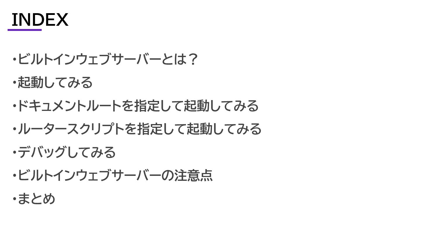 ・ビルトインウェブサーバーとは? ・起動してみる ・ドキュメントルートを指定して起動してみる ・ルータースクリプトを指定して起動してみる ・デバッグしてみる ・ビルトインウェブサーバーの注意点 ・まとめ INDEX