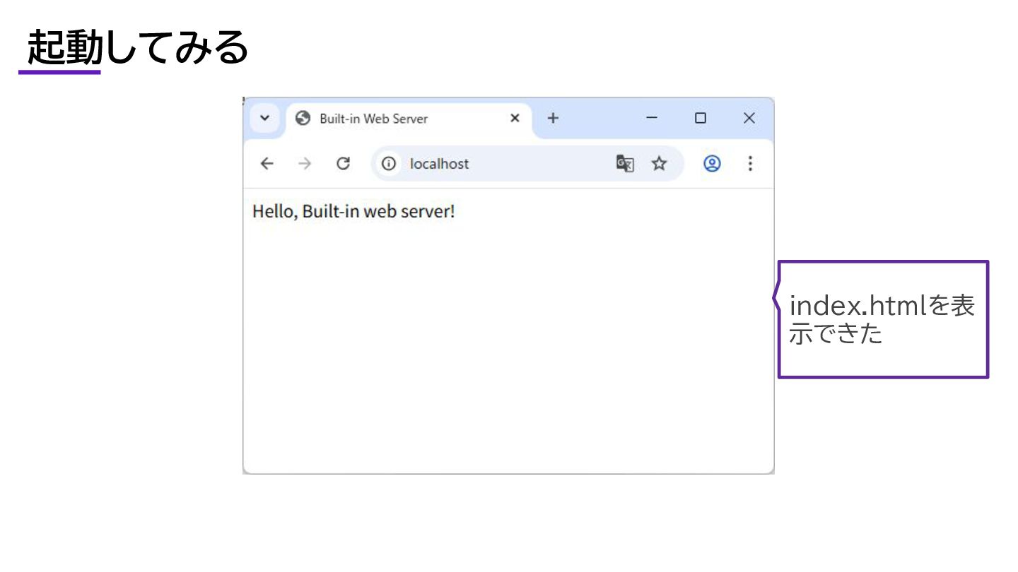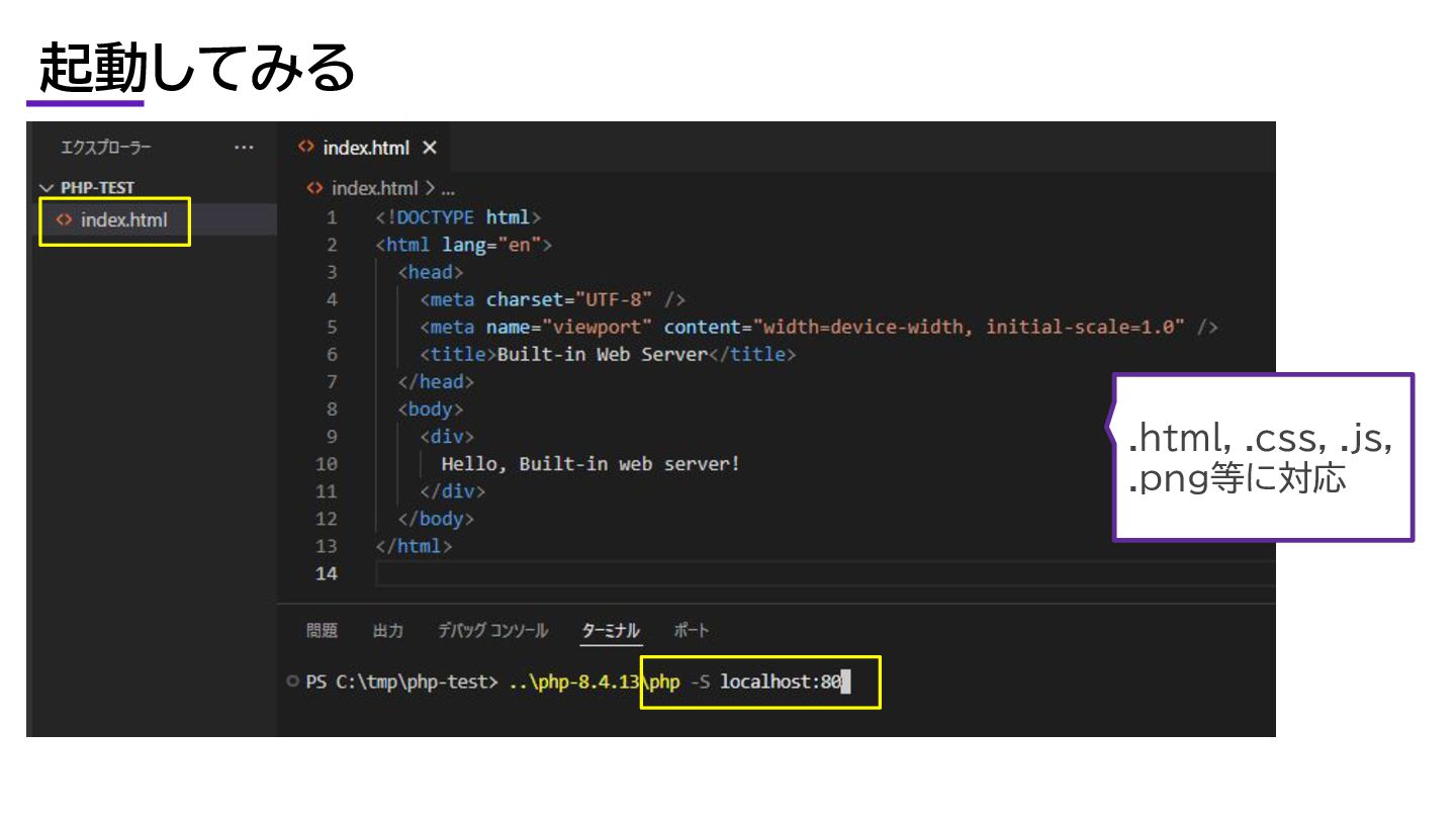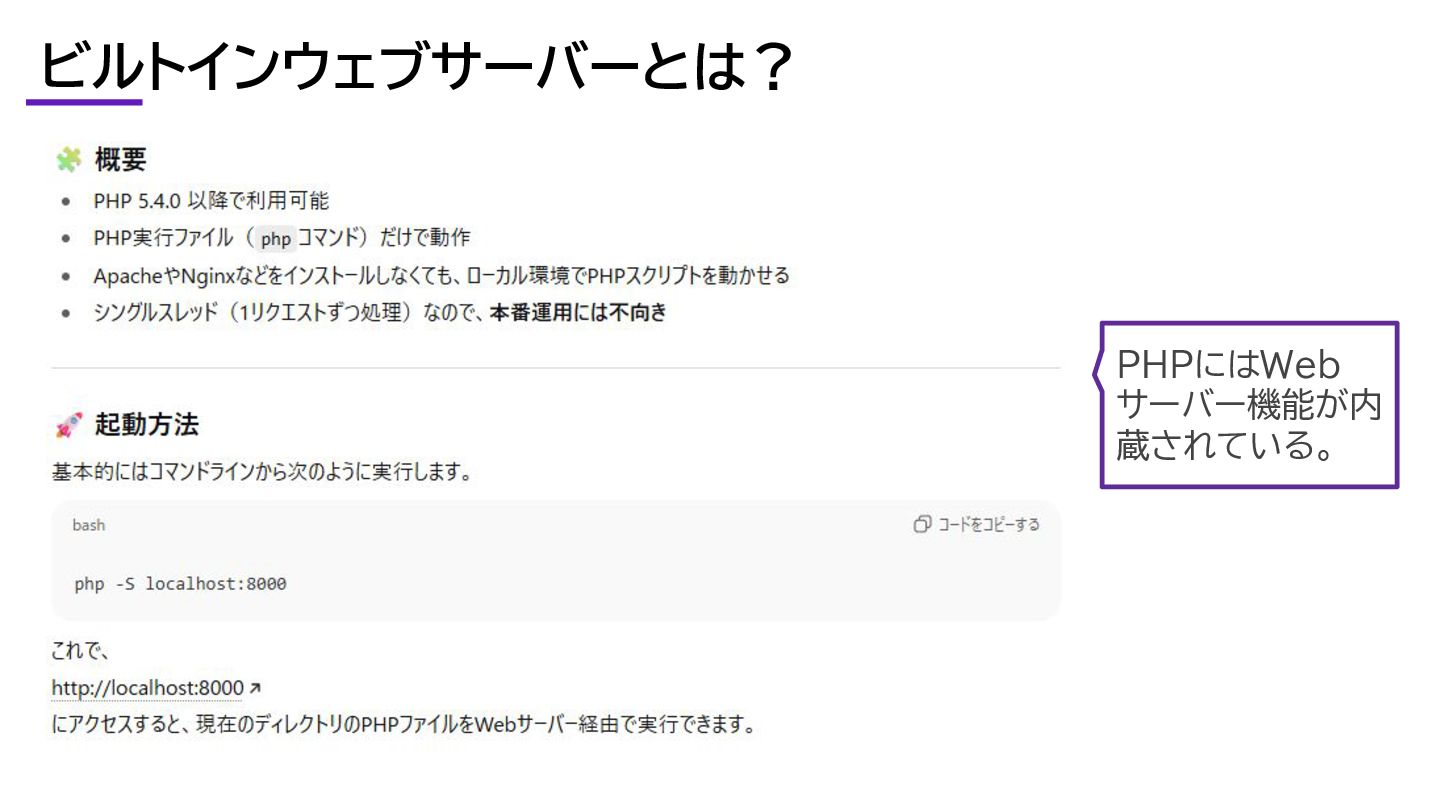 ビルトインウェブサーバーとは? PHPにはWeb サーバー機能が内 蔵されている。