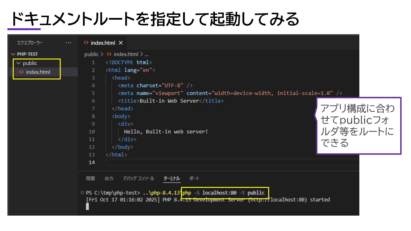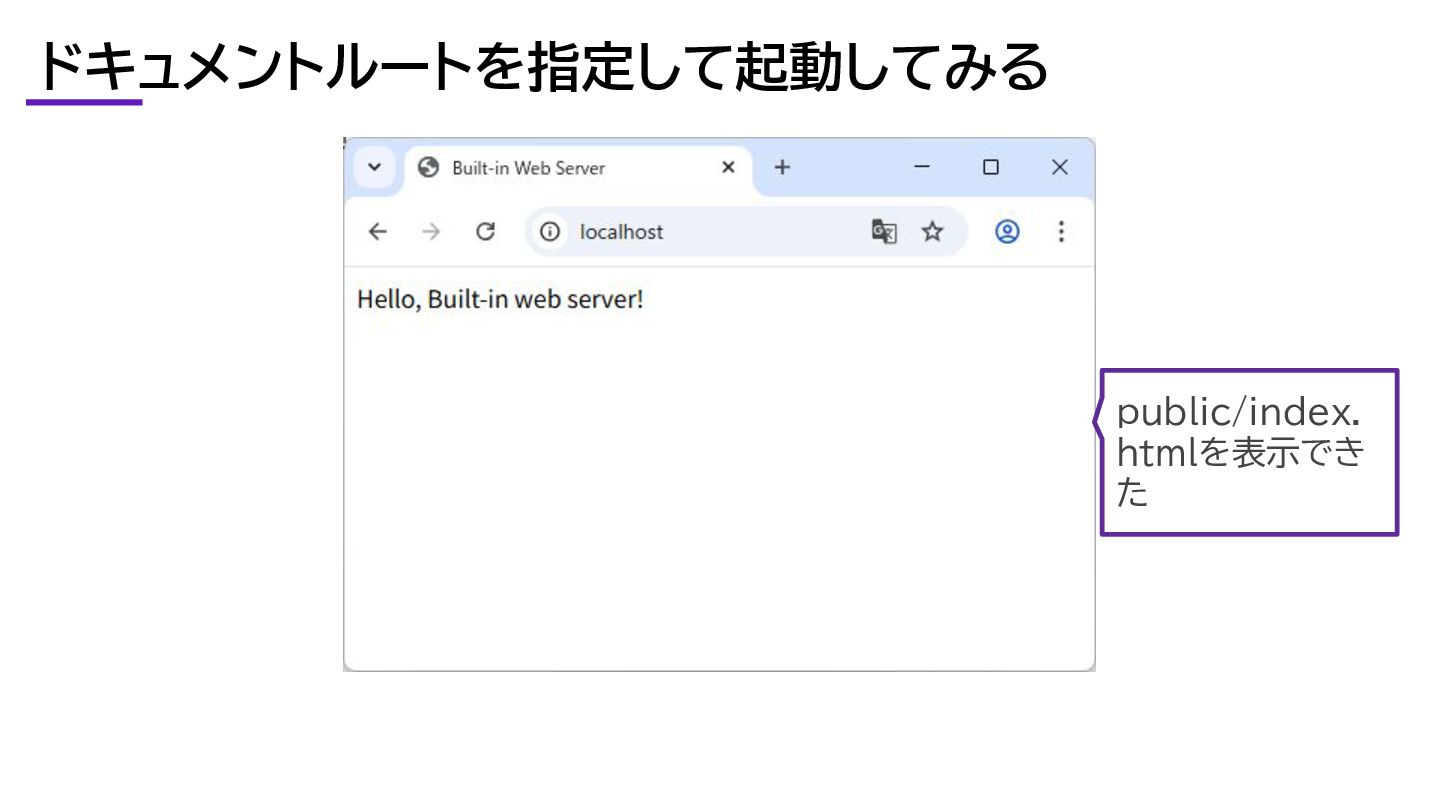 ・PHP5.4以降、開発に使用できるウェブサーバーが組み込まれている ・ドキュメントルートを指定できる ・ルータースクリプトを指定できる ・URLのファイルがない場合、ドキュメントルートまで index.php または index.html を探す ・index.php または