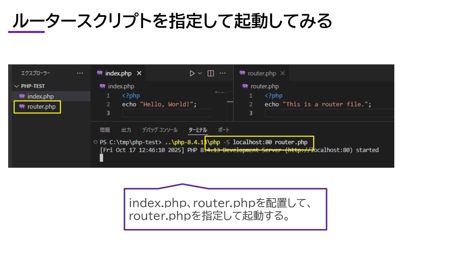 ルータースクリプトを指定して起動してみる index.php、router.phpを配置して、 router.phpを指定して起動する。