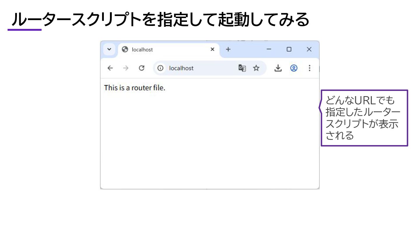 ルータースクリプトを指定して起動してみる どんなURLでも 指定したルーター スクリプトが表示 される