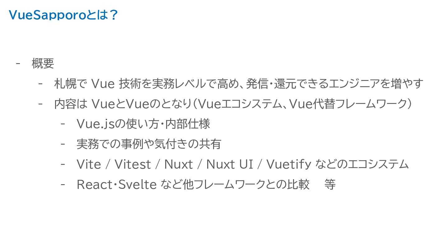 VueSapporoとは? - 概要 - 札幌で Vue 技術を実務レベルで高め、発信・還元できるエンジニアを増やす - 内容は VueとVueのとなり(Vueエコシステム、Vue代替フレームワーク)