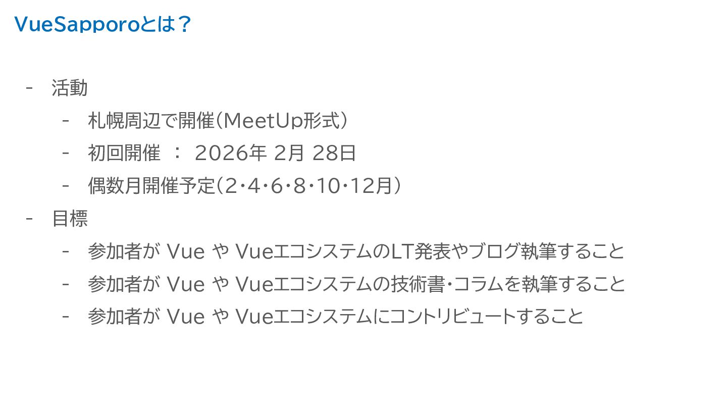 VueSapporoとは? - 活動 - 札幌周辺で開催(MeetUp形式) - 初回開催 : 2026年 2月 28日 -