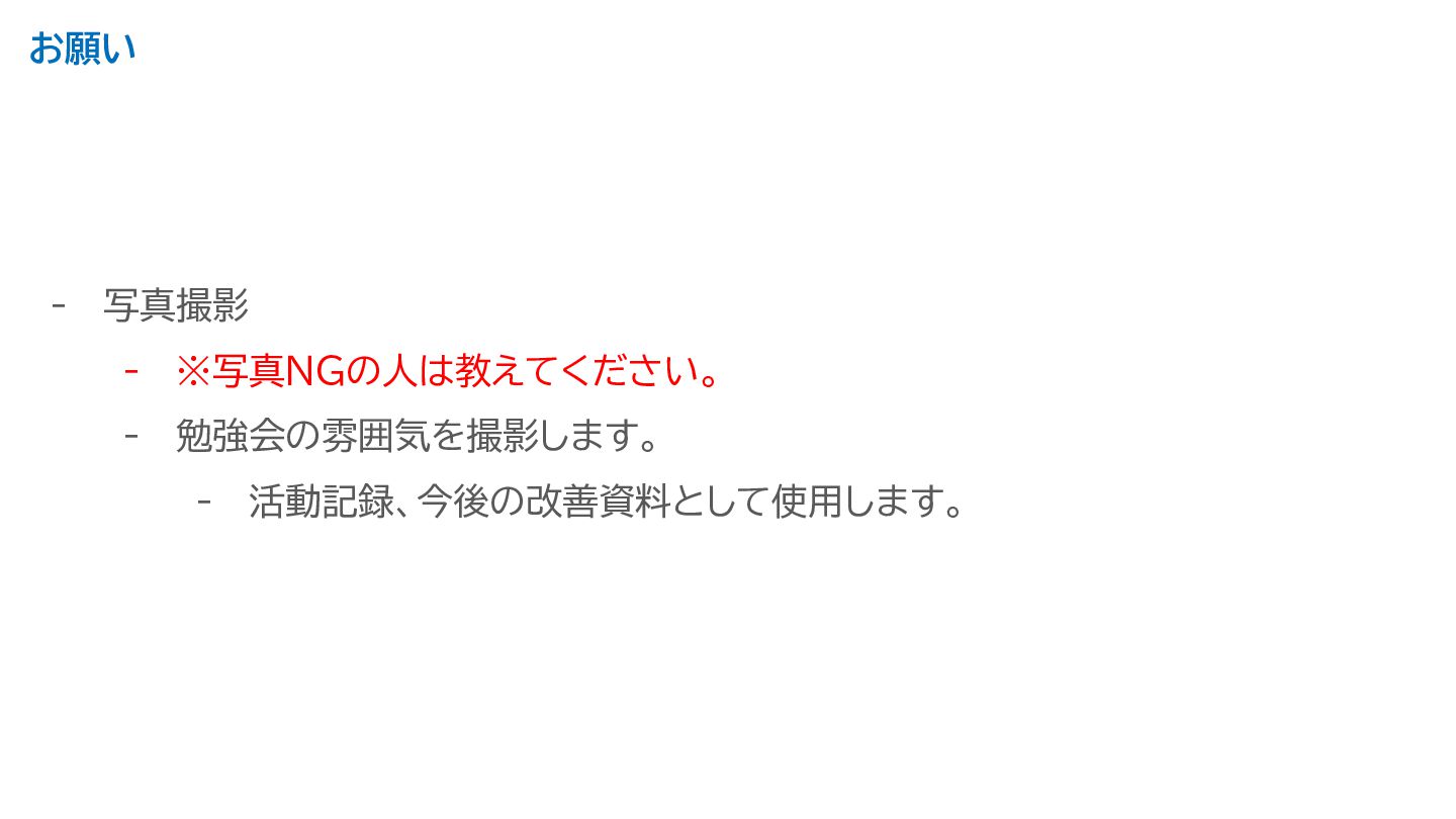 お願い - 写真撮影 - ※写真NGの人は教えてください。 - 勉強会の雰囲気を撮影します。 - 活動記録、今後の改善資料として使用します。