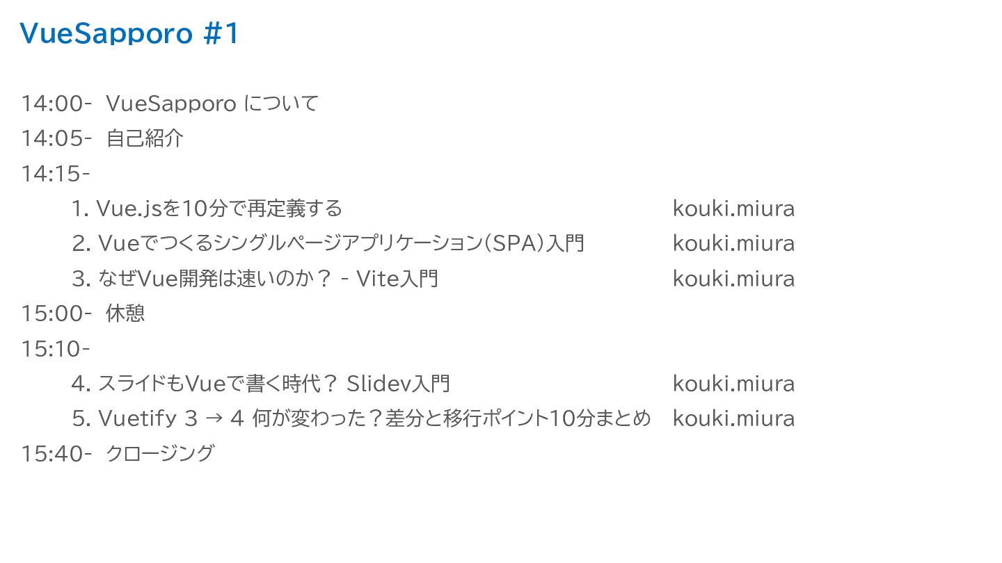 kouki.miura 2. Vueでつくるシングルページアプリケーション(SPA)入門 kouki.miura 3. なぜVue開発は速いのか? - Vite入門 kouki.miura 15:00- 休憩 15:10- 4. スライドもVueで書く時代? Slidev入門 kouki.miura 5. Vuetify 3 → 4 何が変わった?差分と移行ポイント10分まとめ kouki.miura 15:40- クロージング