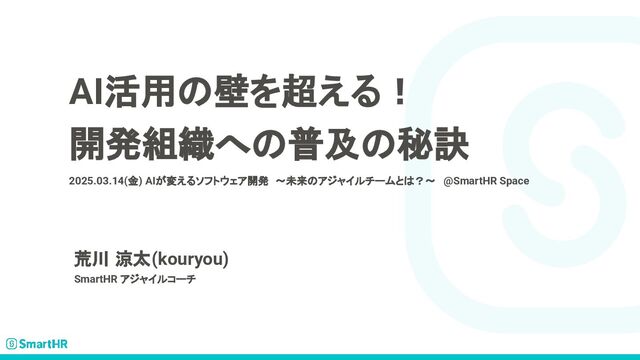 AI活用の壁を超える! 開発組織への普及の秘訣 2025.03.14(金) AIが変えるソフトウェア開発 〜未来のアジャイルチームとは?〜 @SmartHR Space 荒川 涼太(kouryou) SmartHR