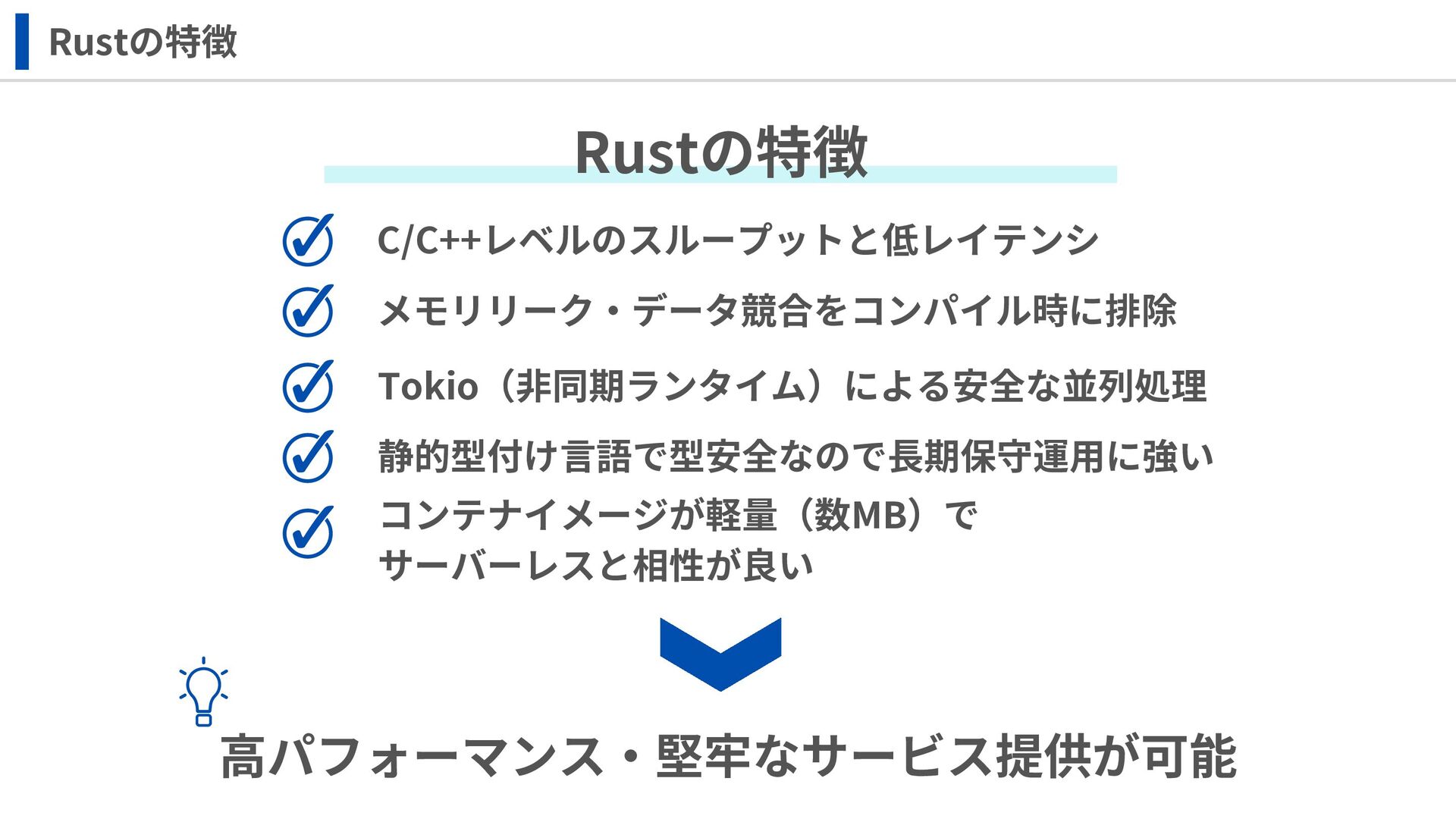 Rustの特徴 C/C++レベルのスループットと低レイテンシ メモリリーク・データ競合をコンパイル時に排除 Tokio(非同期ランタイム)による安全な並列処理 Rustの特徴 高パフォーマンス・堅牢なサービス提供が可能 静的型付け言語で型安全なので長期保守運用に強い コンテナイメージが軽量(数MB)で サーバーレスと相性が良い