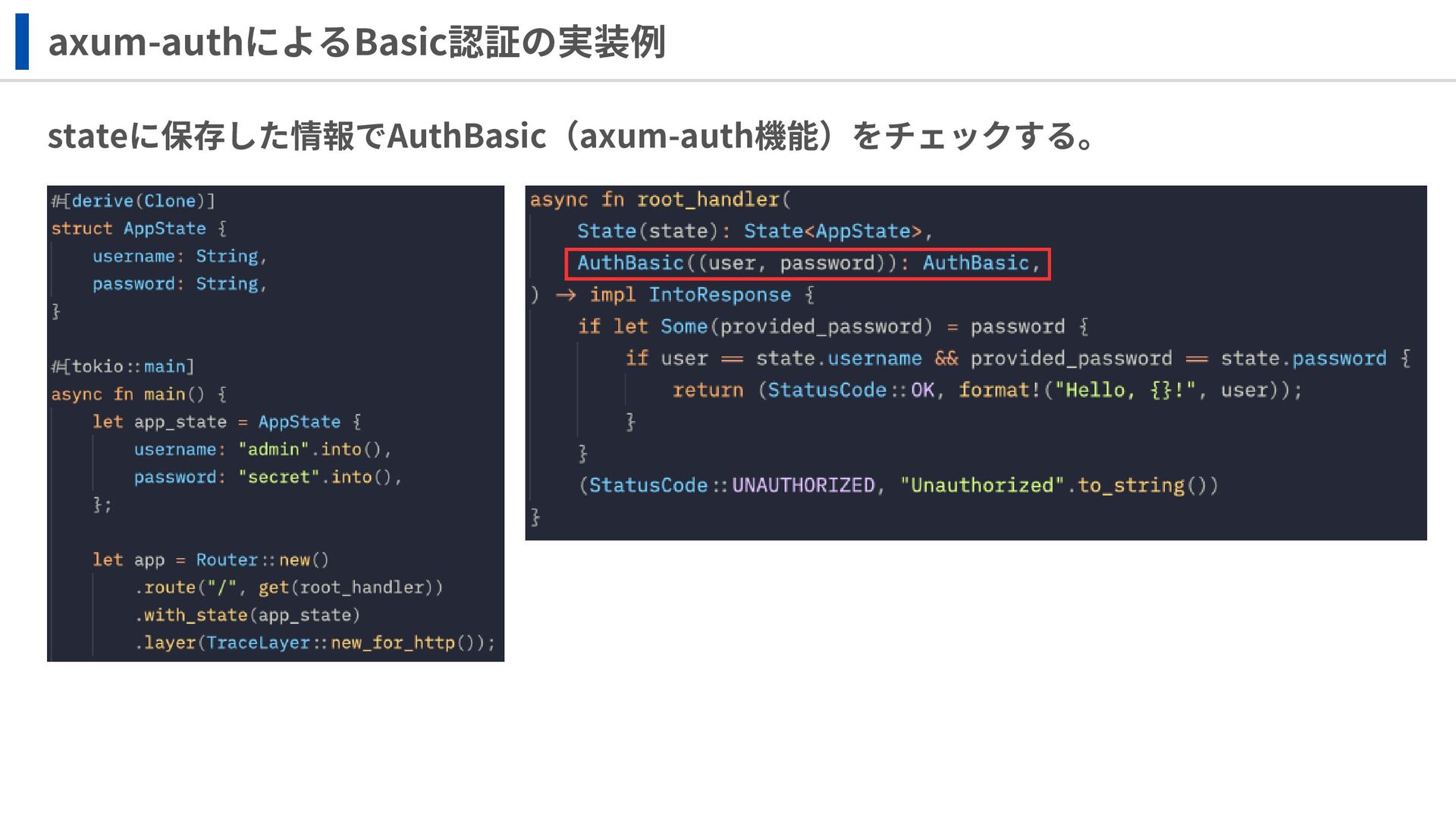 axum-authによるBasic認証の実装例 stateに保存した情報でAuthBasic(axum-auth機能)をチェックする。