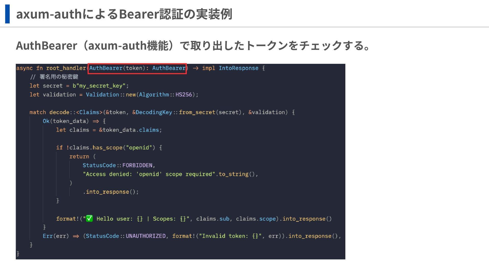axum-authによるBearer認証の実装例 AuthBearer(axum-auth機能)で取り出したトークンをチェックする。