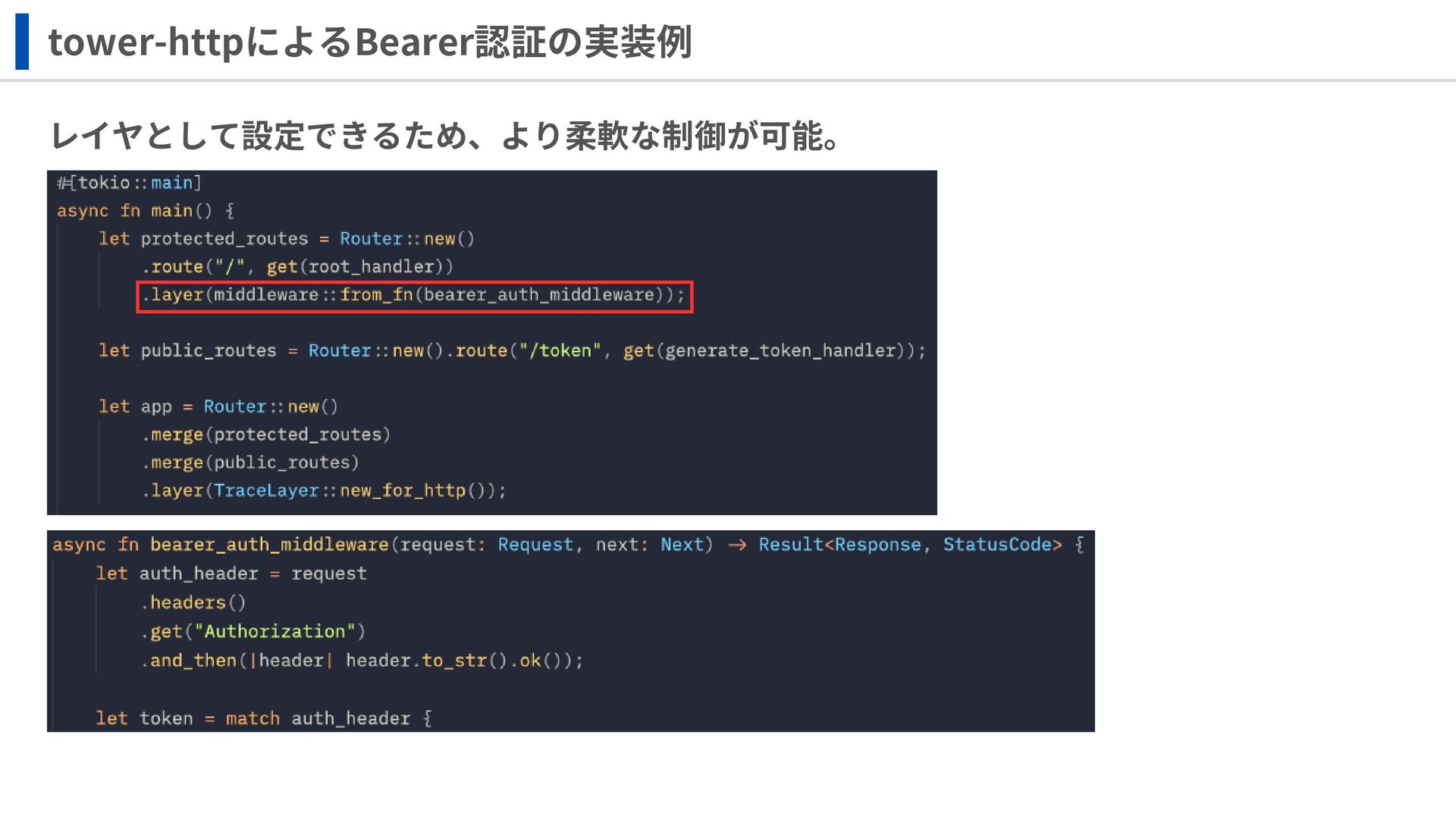 tower-httpによるBearer認証の実装例 レイヤとして設定できるため、より柔軟な制御が可能。