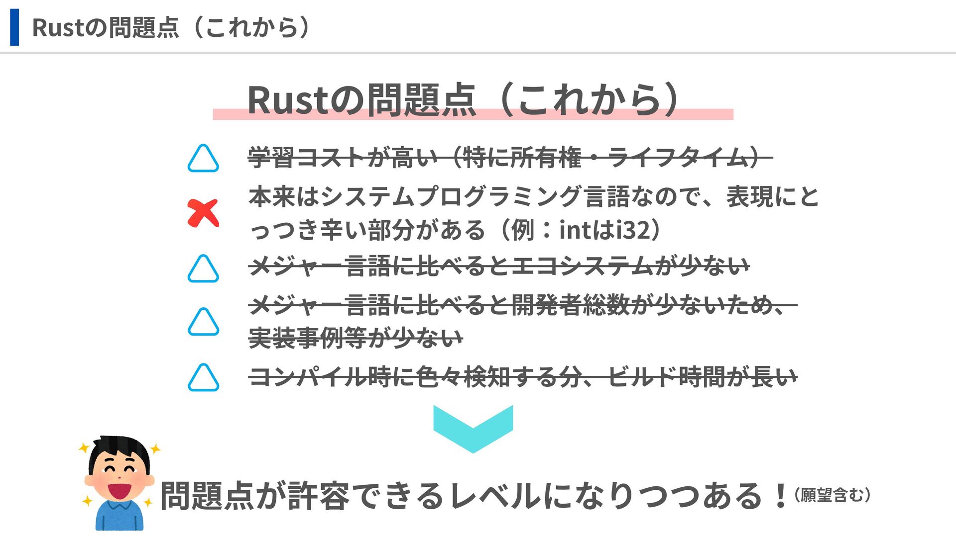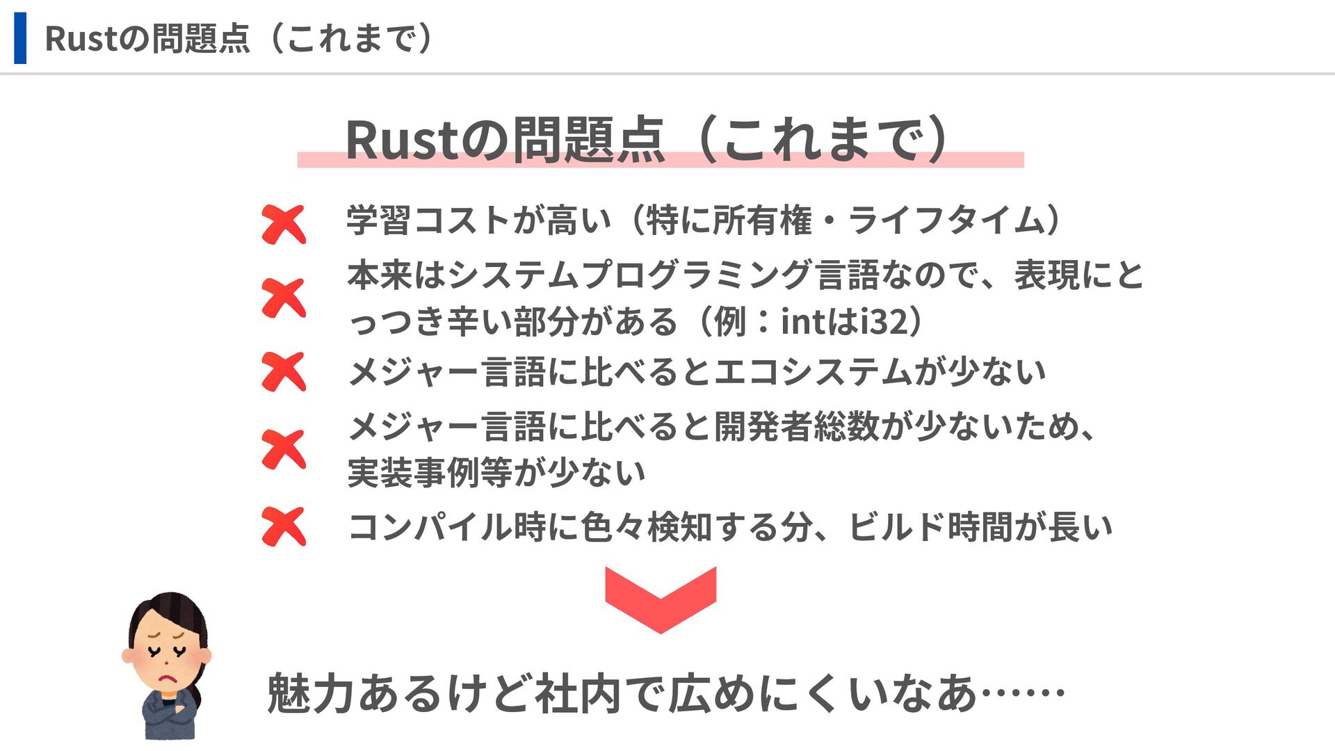 Rustの問題点(これまで) 学習コストが高い(特に所有権・ライフタイム) メジャー言語に比べると開発者総数が少ないため、 実装事例等が少ない メジャー言語に比べるとエコシステムが少ない Rustの問題点(これまで) 魅力あるけど社内で広めにくいなあ…… 本来はシステムプログラミング言語なので、表現にと っつき辛い部分がある(例:intはi32) コンパイル時に色々検知する分、ビルド時間が長い