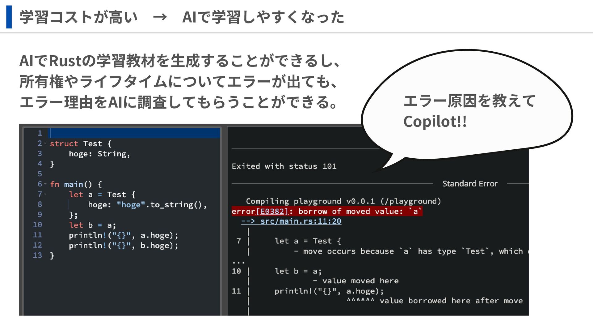 AIでRustの学習教材を生成することができるし、 所有権やライフタイムについてエラーが出ても、 エラー理由をAIに調査してもらうことができる。 学習コストが高い → AIで学習しやすくなった エラー原因を教えて Copilot!!