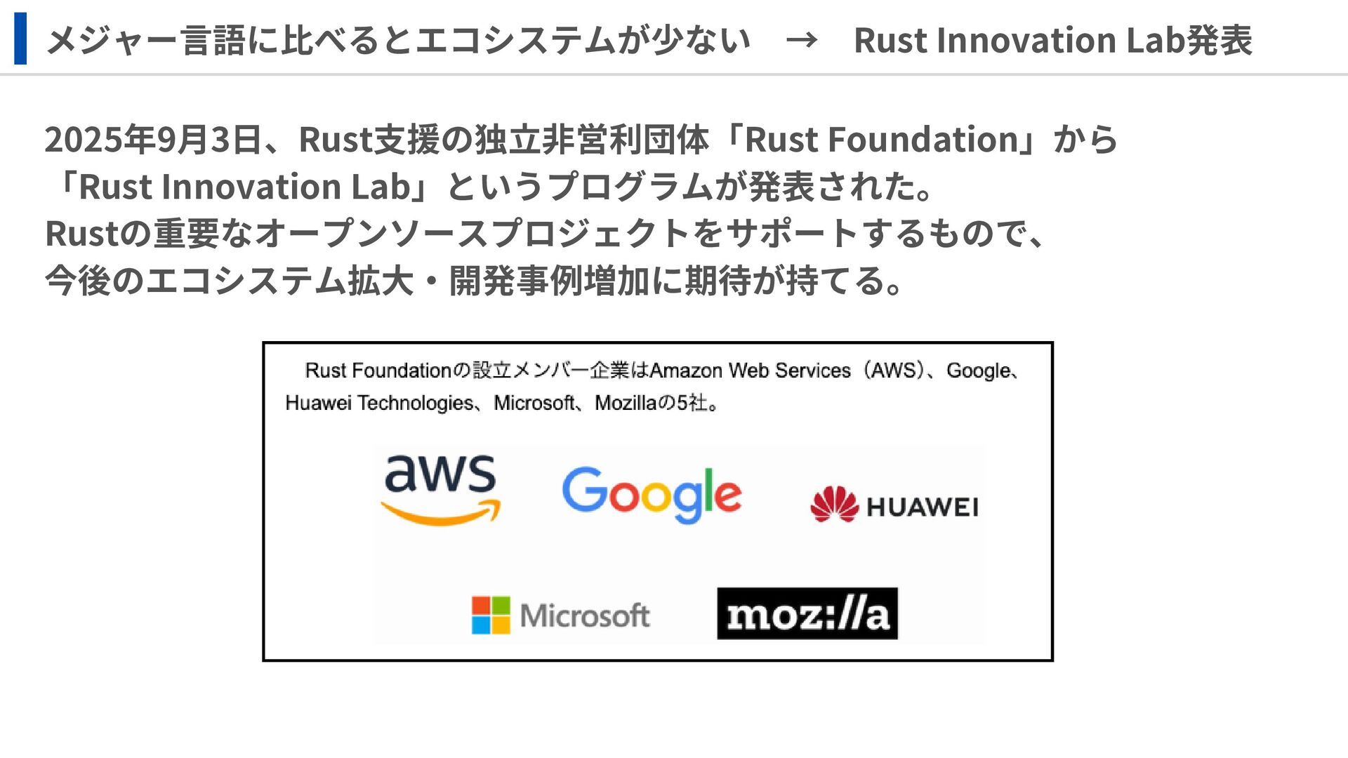 2025年9月3日、Rust支援の独立非営利団体「Rust Foundation」から 「Rust Innovation Lab」というプログラムが発表された。 Rustの重要なオープンソースプロジェクトをサポートするもので、 今後のエコシステム拡大・開発事例増加に期待が持てる。 メジャー言語に比べるとエコシステムが少ない → Rust Innovation Lab発表