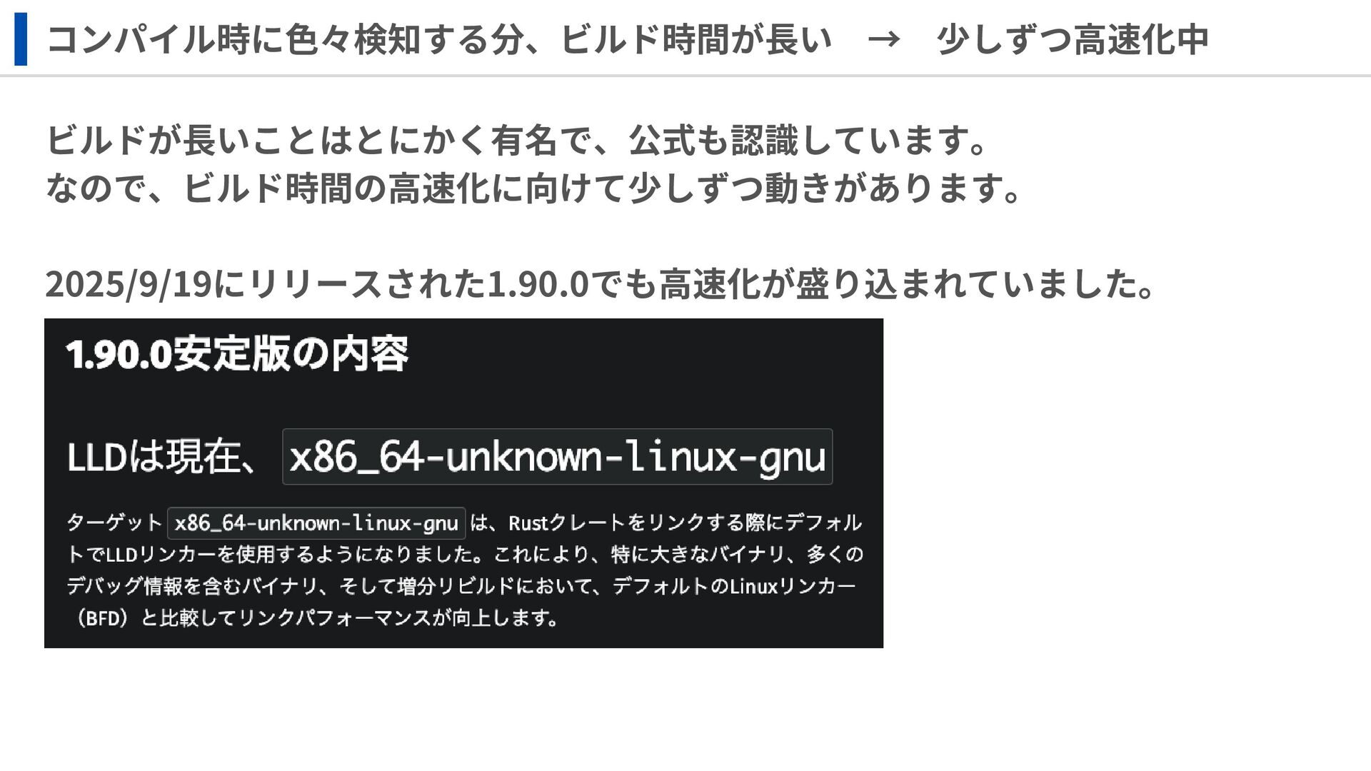 ビルドが長いことはとにかく有名で、公式も認識しています。 なので、ビルド時間の高速化に向けて少しずつ動きがあります。 2025/9/19にリリースされた1.90.0でも高速化が盛り込まれていました。 コンパイル時に色々検知する分、ビルド時間が長い → 少しずつ高速化中