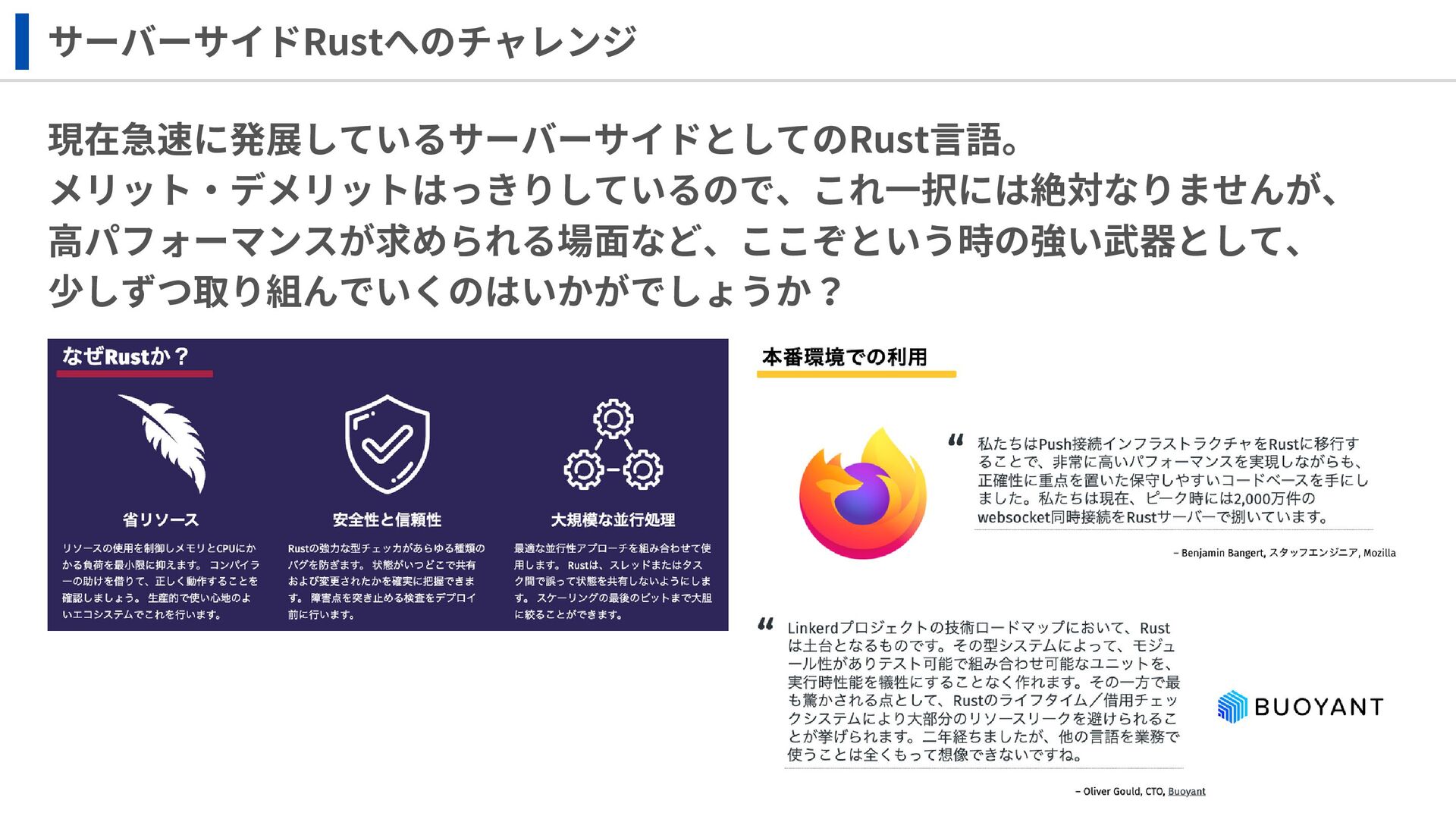 大規模な同期処理の安定化を報告 Rustで独自のフレームワークを開発・サービス提供 Python・C#からRustに移行したことで省リソース化、 動作の堅牢化を報告 Push通知配信基盤をRubyからRustに移行、 マルチスレッドの安全な実装・高速化を報告 Rustでサーバーサイド実装、Deno自体もRust実装