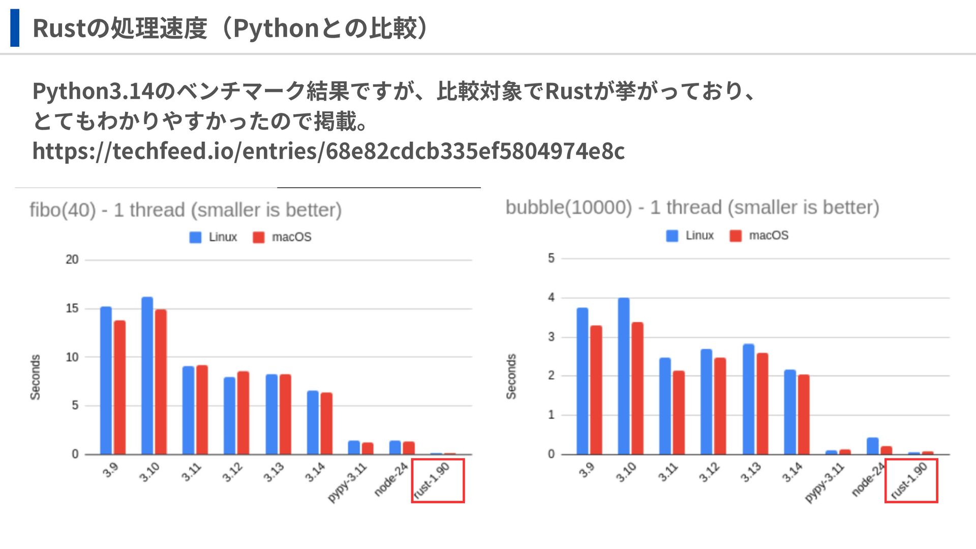 Rustの処理速度(Pythonとの比較) Python3.14のベンチマーク結果ですが、比較対象でRustが挙がっており、 とてもわかりやすかったので掲載。 https://techfeed.io/entries/68e82cdcb335ef5804974e8c