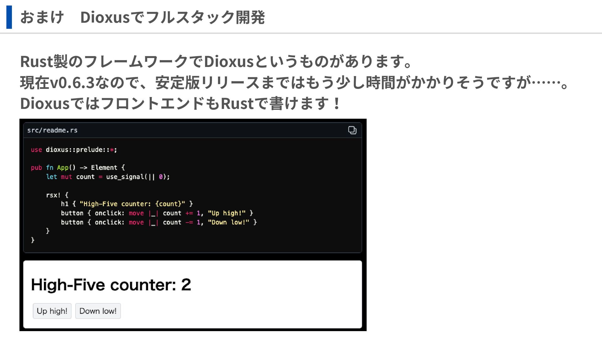 おまけ Dioxusでフルスタック開発 Rust製のフレームワークでDioxusというものがあります。 現在v0.6.3なので、安定版リリースまではもう少し時間がかかりそうですが……。 DioxusではフロントエンドもRustで書けます!