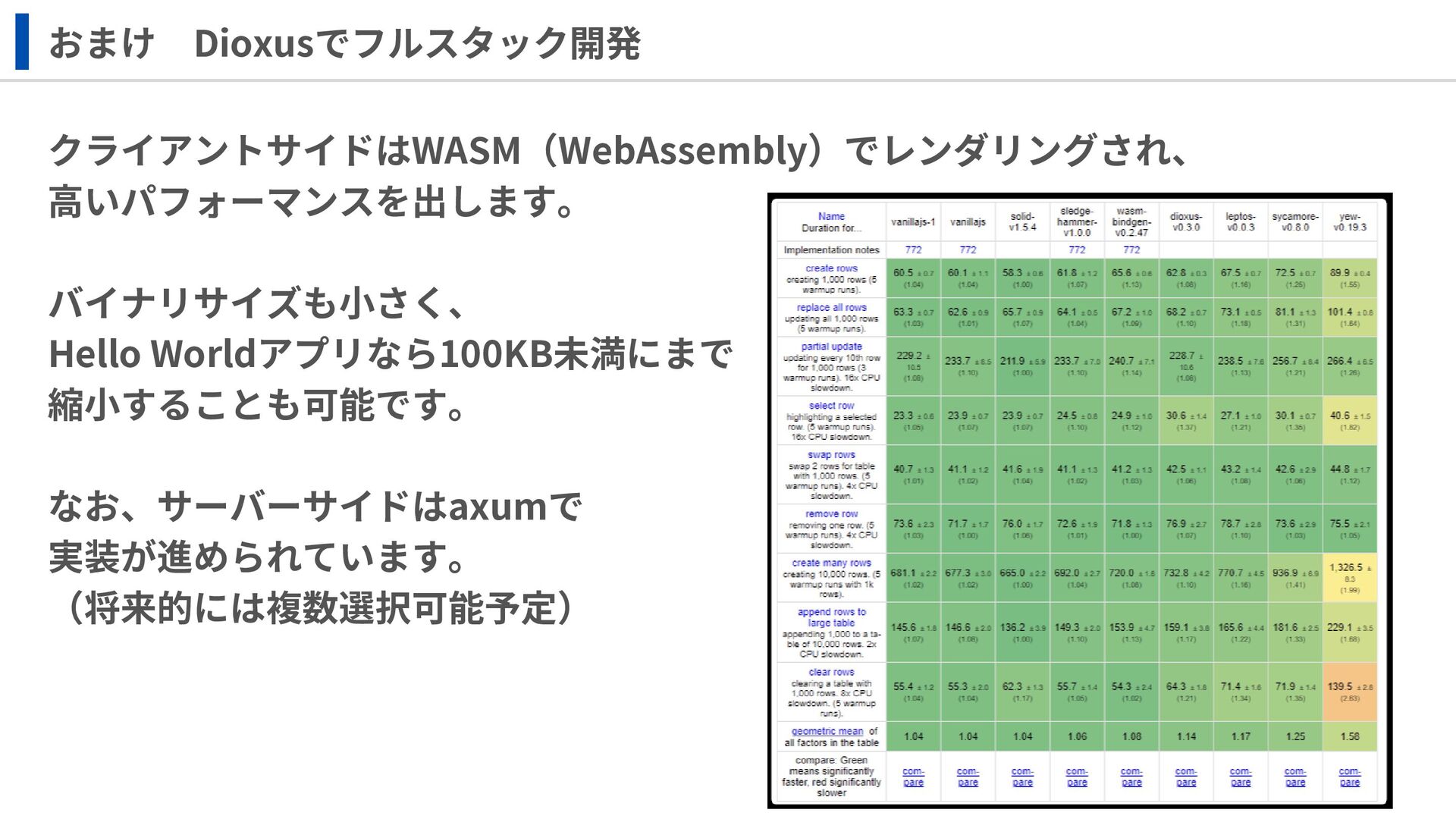 おまけ Dioxusでフルスタック開発 クライアントサイドはWASM(WebAssembly)でレンダリングされ、 高いパフォーマンスを出します。 バイナリサイズも小さく、 Hello Worldアプリなら100KB未満にまで 縮小することも可能です。 なお、サーバーサイドはaxumで 実装が進められています。 (将来的には複数選択可能予定)