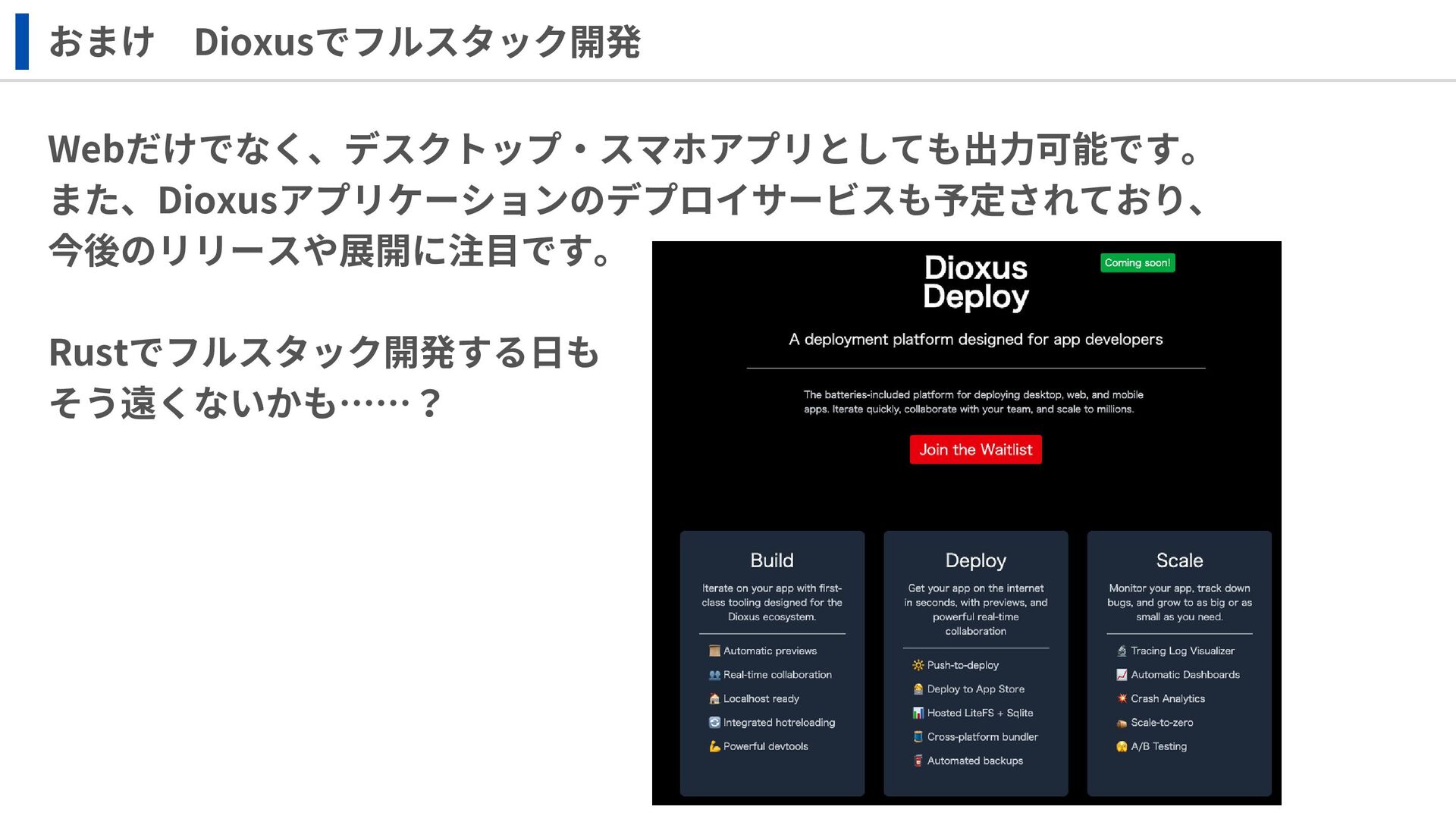 おまけ Dioxusでフルスタック開発 Webだけでなく、デスクトップ・スマホアプリとしても出力可能です。 また、Dioxusアプリケーションのデプロイサービスも予定されており、 今後のリリースや展開に注目です。 Rustでフルスタック開発する日も そう遠くないかも……?