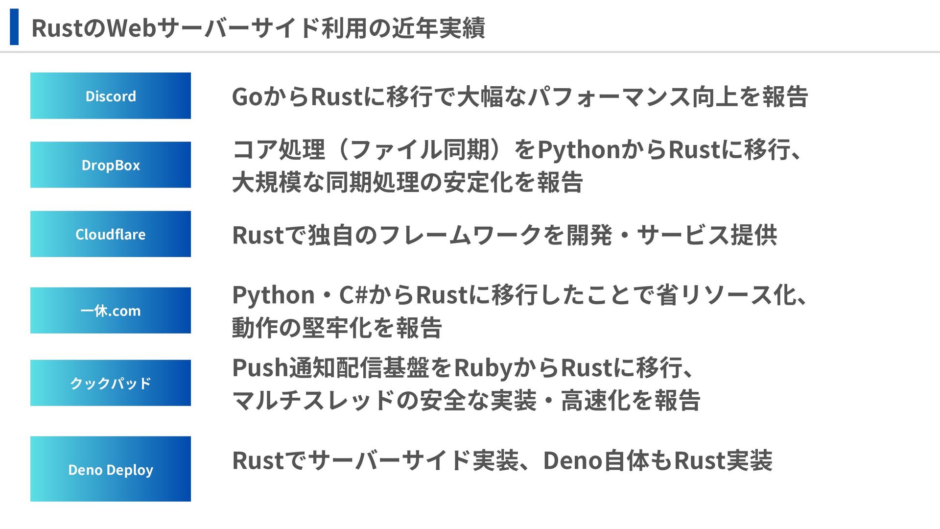 RustのWebサーバーサイド利用の近年実績 Discord DropBox Cloudflare 一休.com クックパッド Deno Deploy GoからRustに移行で大幅なパフォーマンス向上を報告 コア処理(ファイル同期)をPythonからRustに移行、