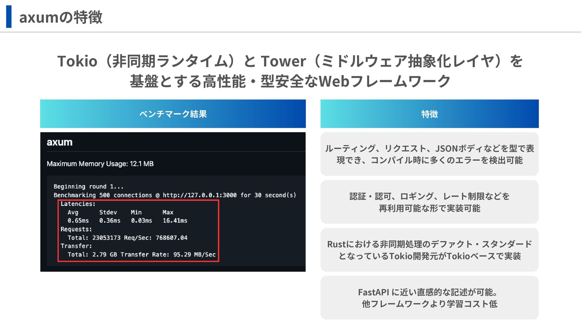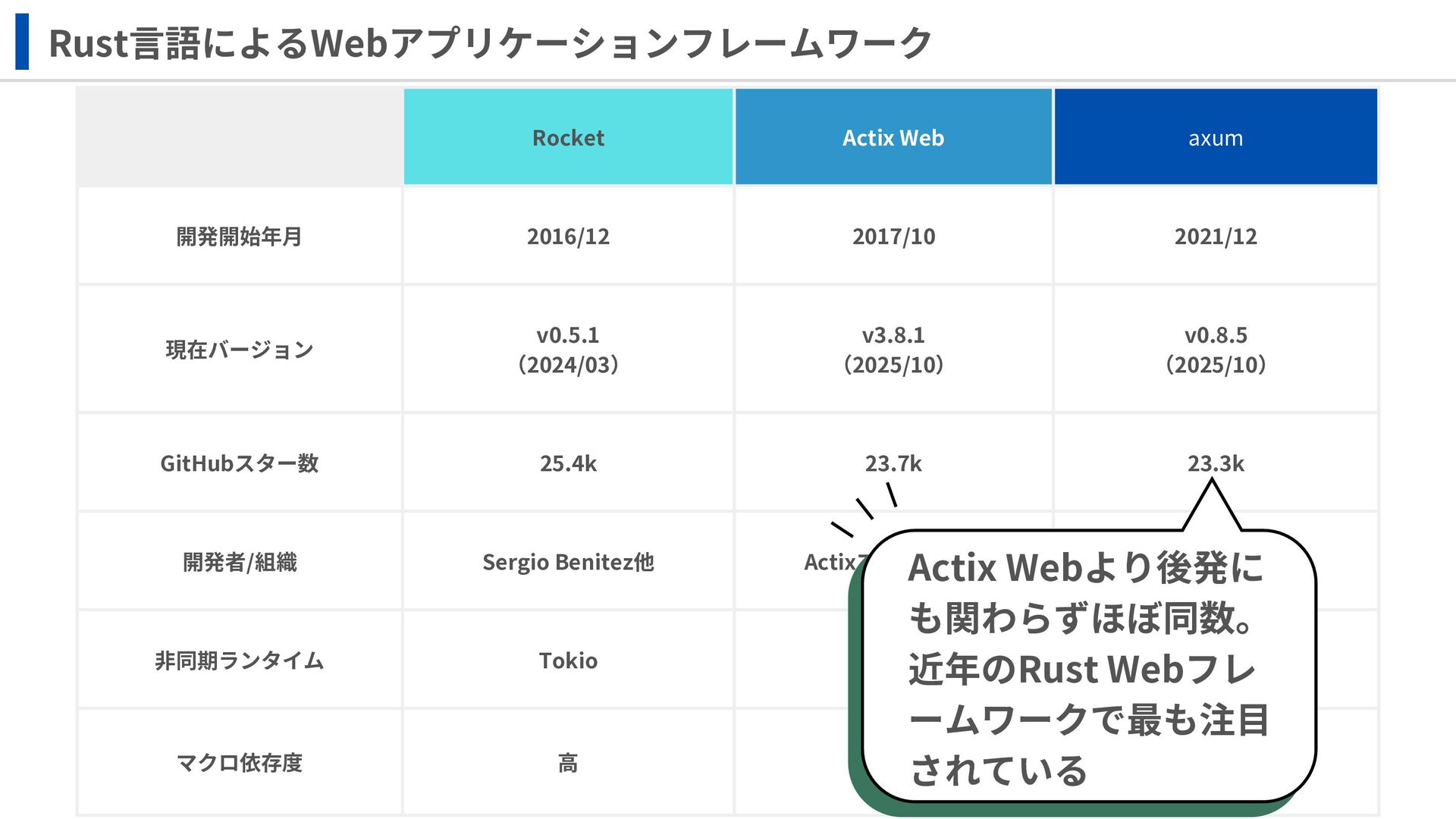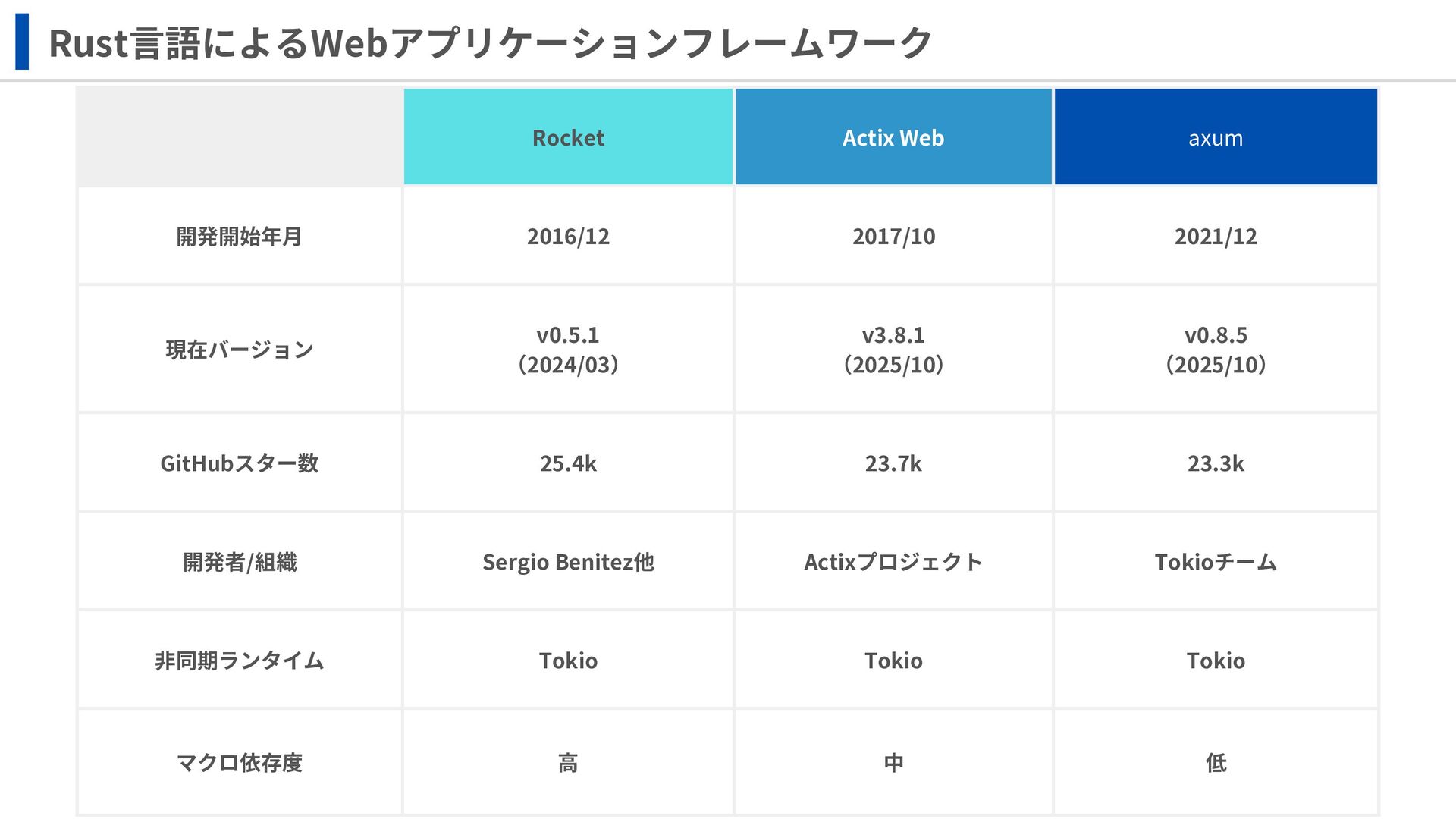 (2024/03) v3.8.1 (2025/10) v0.8.5 (2025/10) GitHubスター数 25.4k 23.7k 23.3k 開発者/組織 Sergio Benitez他 Actixプロジェクト Tokioチーム 非同期ランタイム Tokio Tokio Tokio マクロ依存度 高 中 低 Rust言語によるWebアプリケーションフレームワーク