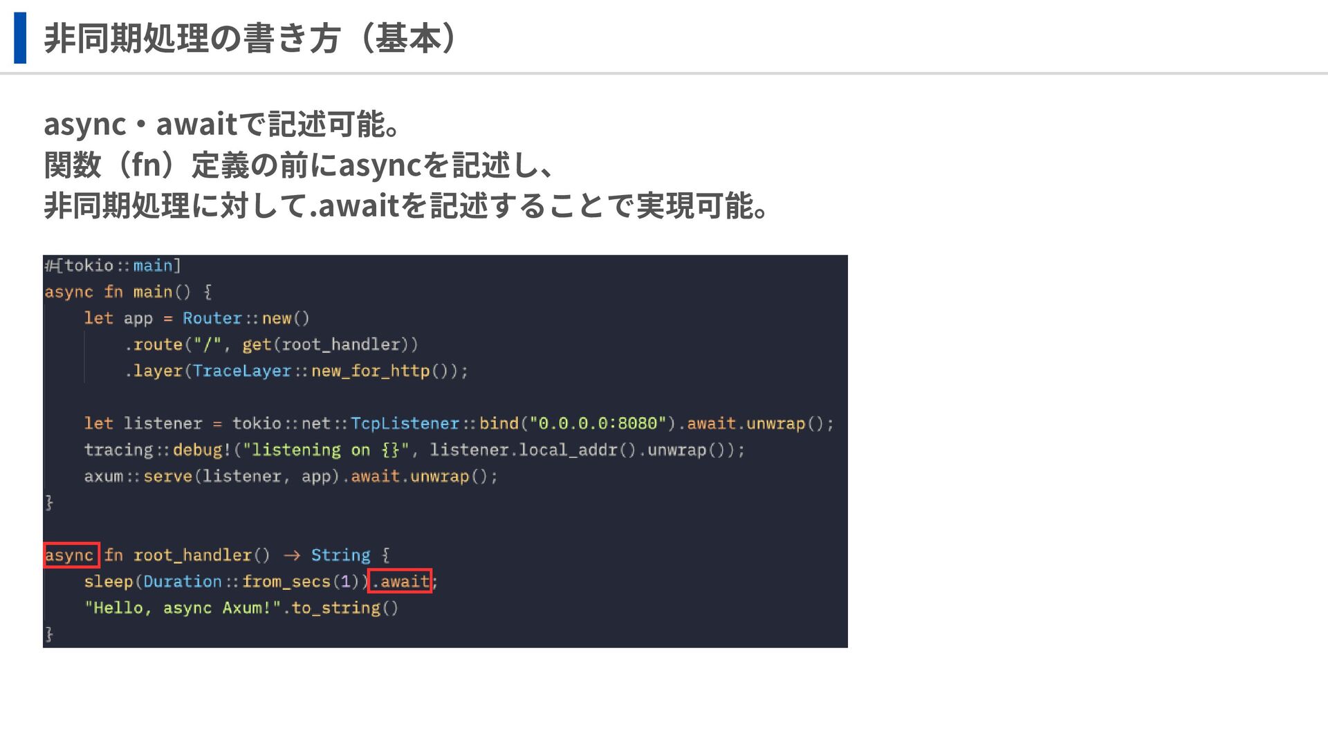 非同期処理の書き方(基本) async・awaitで記述可能。 関数(fn)定義の前にasyncを記述し、 非同期処理に対して.awaitを記述することで実現可能。