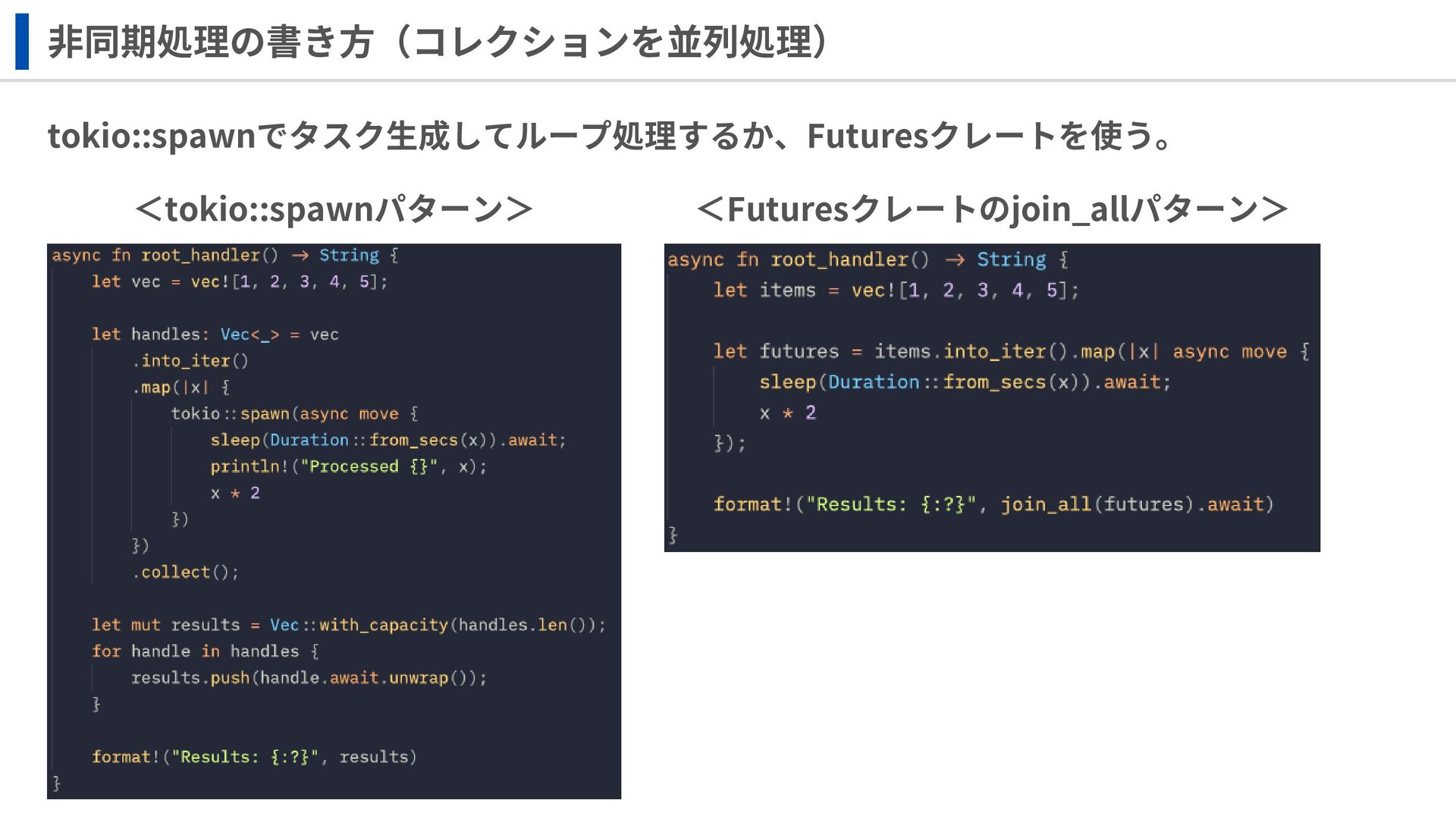 非同期処理の書き方(コレクションを並列処理) tokio::spawnでタスク生成してループ処理するか、Futuresクレートを使う。 <tokio::spawnパターン> <Futuresクレートのjoin_allパターン>