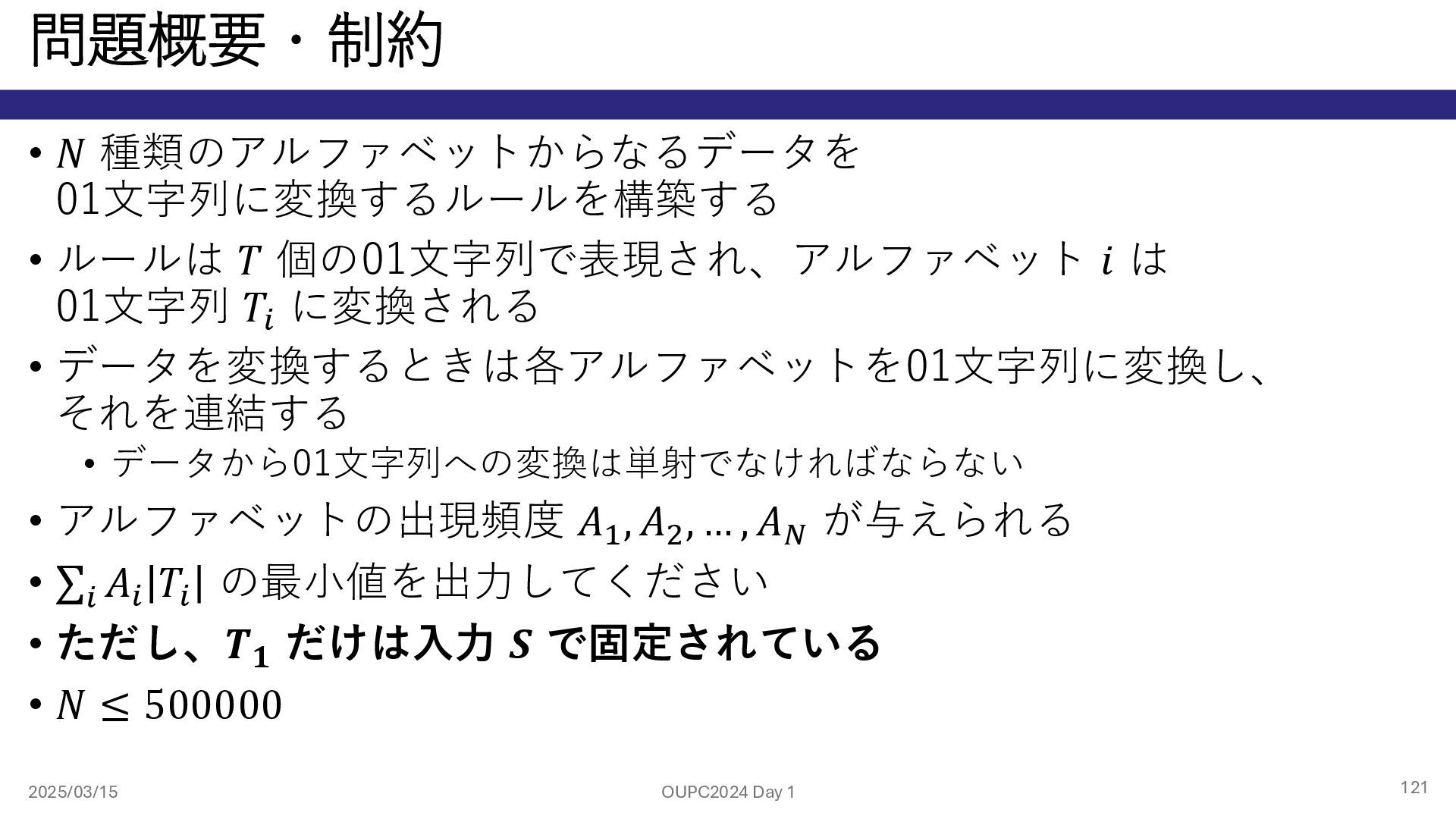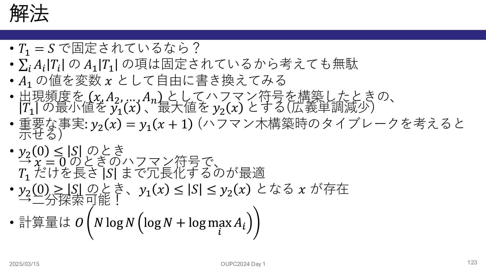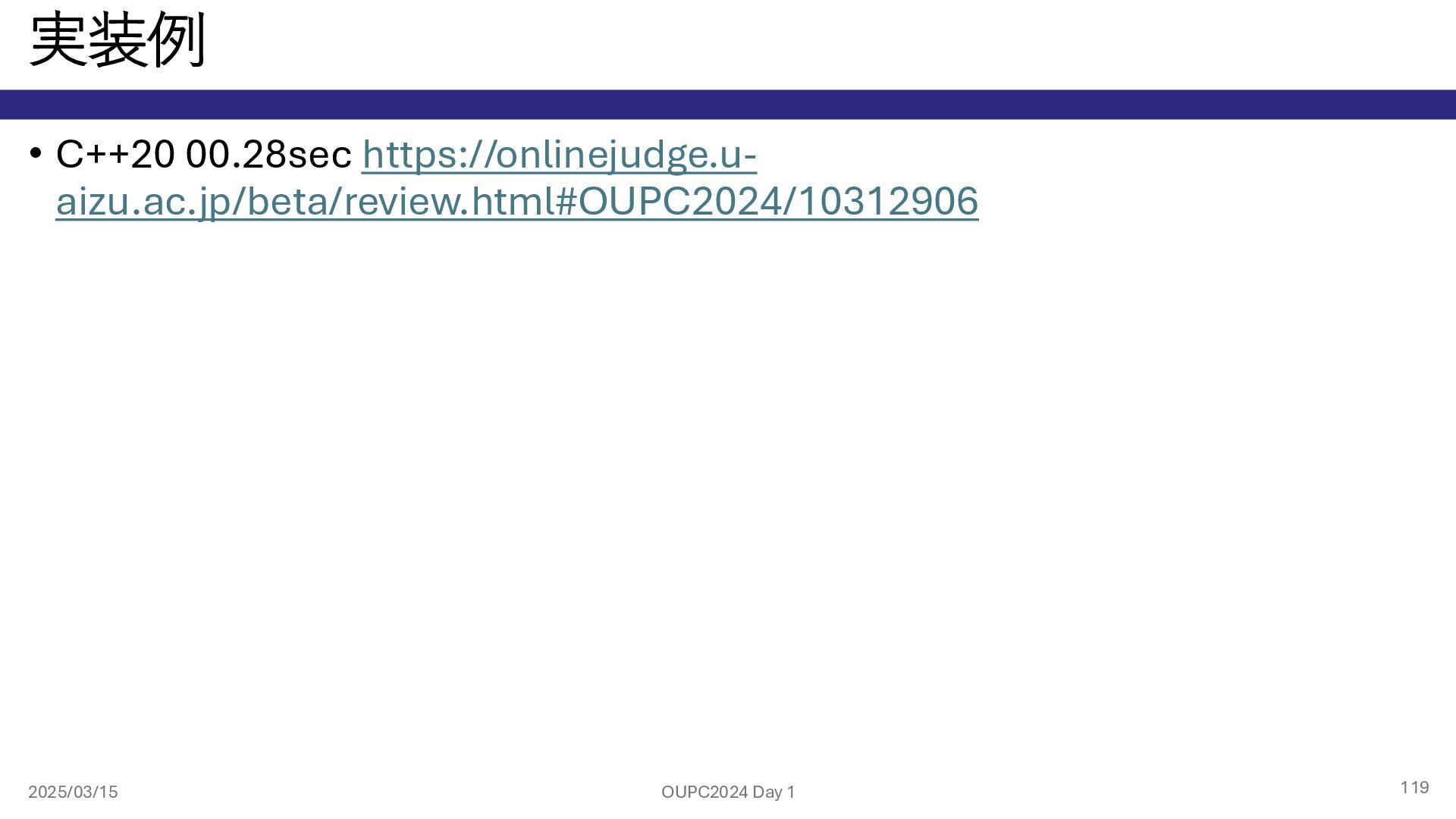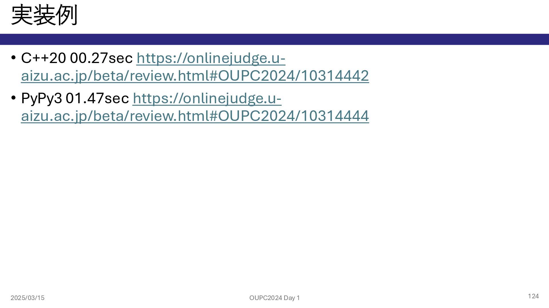 , 𝑔 𝑆2 , 𝑔 𝑆3 , 𝑔 𝑓 𝑆1 , 𝑆2 , 𝑔 𝑓 𝑆1 , 𝑆3 , 𝑔 𝑓 𝑆2 , 𝑆3 , 𝑔 𝑓 𝑓 𝑆1 , 𝑆2 , 𝑆3 の7つが分かればよくてこれは再帰で求まる • 𝑂(7𝐾) (最初𝐾 ≤ 9にしてて遅い言語にだけメモ化を要求しそうだったので8になった) 2025/03/15 OUPC2024 Day 1 56 𝑔 𝑆 = 全体 − 𝑆1 = 𝑆2 ≠ 𝑆3 のとき − 𝑆1 = 𝑆3 ≠ 𝑆2 − 𝑆2 = 𝑆3 ≠ 𝑆1 − 𝑆1 = 𝑆2 = 𝑆3 = 𝑔 𝑆1 𝑔 𝑆2 𝑔 𝑆3 − 𝑔 𝑓 𝑆1 , 𝑆2 𝑔 𝑆3 − 𝑔 𝑓 𝑓 𝑆1 , 𝑆2 , 𝑆3 − ቀ ቁ 𝑔 𝑓 𝑆1 , 𝑆3 𝑔 𝑆2 − 𝑔 𝑓 𝑓 𝑆1 , 𝑆2 , 𝑆3 − 𝑔 𝑓 𝑆2 , 𝑆3 𝑔 𝑆1 − 𝑔 𝑓 𝑓 𝑆1 , 𝑆2 , 𝑆3 − 𝑔 𝑓 𝑓 𝑆1 , 𝑆2 , 𝑆3 = 𝑔 𝑆1 𝑔 𝑆2 𝑔 𝑆3 − 𝑔 𝑓 𝑆1 , 𝑆2 𝑔 𝑆3 − 𝑔 𝑓 𝑆1 , 𝑆3 𝑔 𝑆2 − 𝑔 𝑓 𝑆2 , 𝑆3 𝑔 𝑆1 + 2𝑔 𝑓 𝑓 𝑆1 , 𝑆2 , 𝑆3